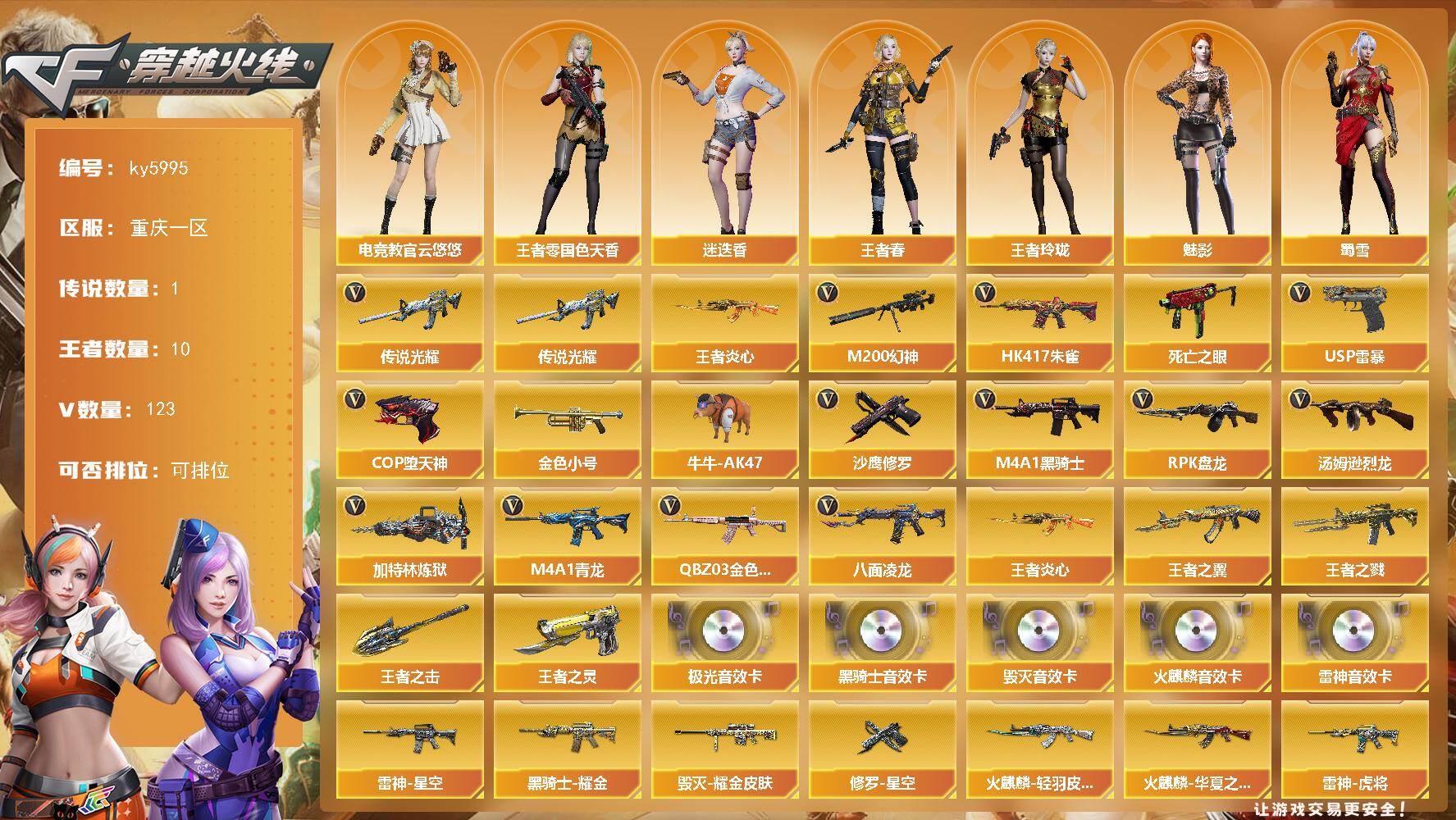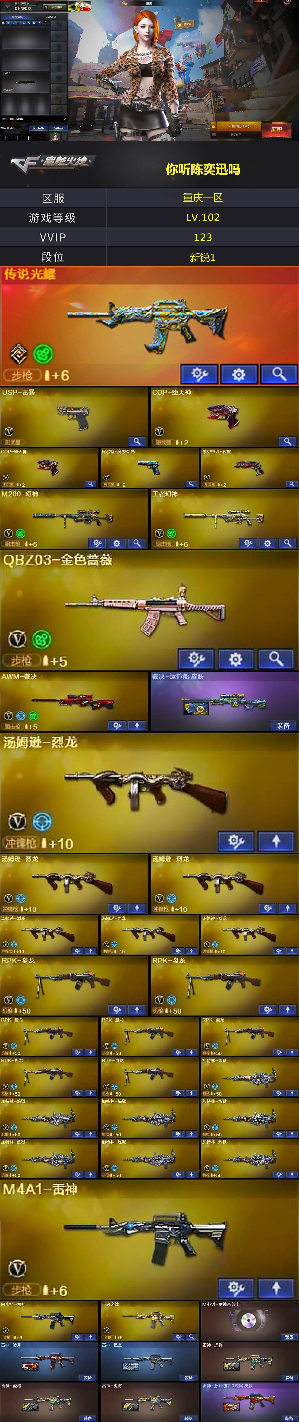 [17231295]重庆一区-133V-10王者武器数-0炫金武器数 【传说武器】:传说光耀 【热门武器】:传说光耀,QBZ03-金色蔷薇,HK417-朱雀,M4A1-青龙,M200-幻神,八面凌龙,死亡之眼*3,王者炎心,金色小号,牛牛-AK47,M4A1-黑骑士*6,汤姆逊-烈龙*6,RPK-盘龙*7,加特林-炼狱*7,USP-雷暴,COP-堕天神*2,沙鹰-修罗*5 【王者炫金武器】:王者炎心,王者之戮,王者之翼,王者之灵,王者之击 【音效卡】:AK47-火麒麟音效卡,M4A1-雷神音效卡,M4A1-黑骑士音效卡,Barrett-毁灭音效卡,Barrett-极光音效卡 【皮肤】:裁决-运输船 皮肤,雷神-暗月,雷神-星空,雷神-虎将*3,雷神-源计划2.0专属 皮肤,火麒麟-雷神,火麒麟-华夏之心,火麒麟-轻羽皮肤,火麒麟-平天大圣,火麒麟-盘古,毁灭耀金皮肤,毁灭-黑大圣皮肤*2,黑骑士耀金皮肤,战神-粉色甜心皮肤,战神-紫绶金章皮肤,战神-流金岁月皮肤,AK47-B-常胜将军-刘备*2,极光-能量核心,炼狱-月 皮肤,修罗-能量核心*2,修罗-星空,屠龙-惊鸿 皮肤,麒麟刺-月皮肤 【角色】:魅影,迷迭香,凌霄,电竞教官-云悠悠,王者-零-国色天香,王者春,王者玲珑,奇洋探员,乔伊教练,修道士,云海玲珑,风暴女,嘉年华灵狐,兰-海滩派对,兰-新年限定,灵狐者-X,灵狐者-黄金海岸,曼陀罗-X,萌儿,潘多拉-X,潜龙队-X,蛇姬,蜀雪,铁骑-乘风破浪,铁骑荣耀,兔囡囡,维纳斯,雪莉杨,夜玫瑰-宠粉,樱-缤纷夏日,影武者-X 【人偶武器】:AWM-灵狐-15周年嘉年华*3,牛牛-AK47,迷你波特博士,夺魂,迷你生化手雷*2,生化手雷-机甲核心,深渊终结者手雷*2,闪光弹-小乔,闪光弹-貂蝉,高爆手雷-大乔,迷你超能女侍,灵狐娃娃手雷 【暴走生化】:死亡之眼*3,超级对讲机 【挑战大师】:神圣爆裂者III,AK47-冰龙粉碎者*2,冰龙粉碎者-白马银枪*2,激光毁灭者III-白马银枪,VEPR-12-金魔,激光毁灭者III 【英雄级武器】:AK47-火麒麟*2,M4A1-雷神*2,M4A1-黑骑士*6,AK47-无影,AK12-天启*3,AN94-超新星,M4A1-青龙,HK417-朱雀,M4A1-夜魔,无影-神兵利器,黑武士-锦绣游龙,八面凌龙,QBZ03-金色蔷薇,9A91