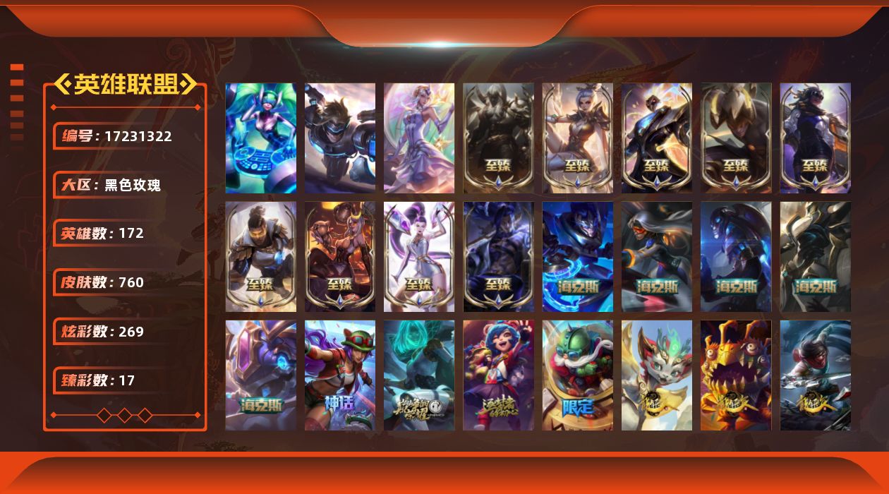 未定级段位-172英雄-760皮肤-269炫彩-3终极-18神话-116限定-65传说-173史诗