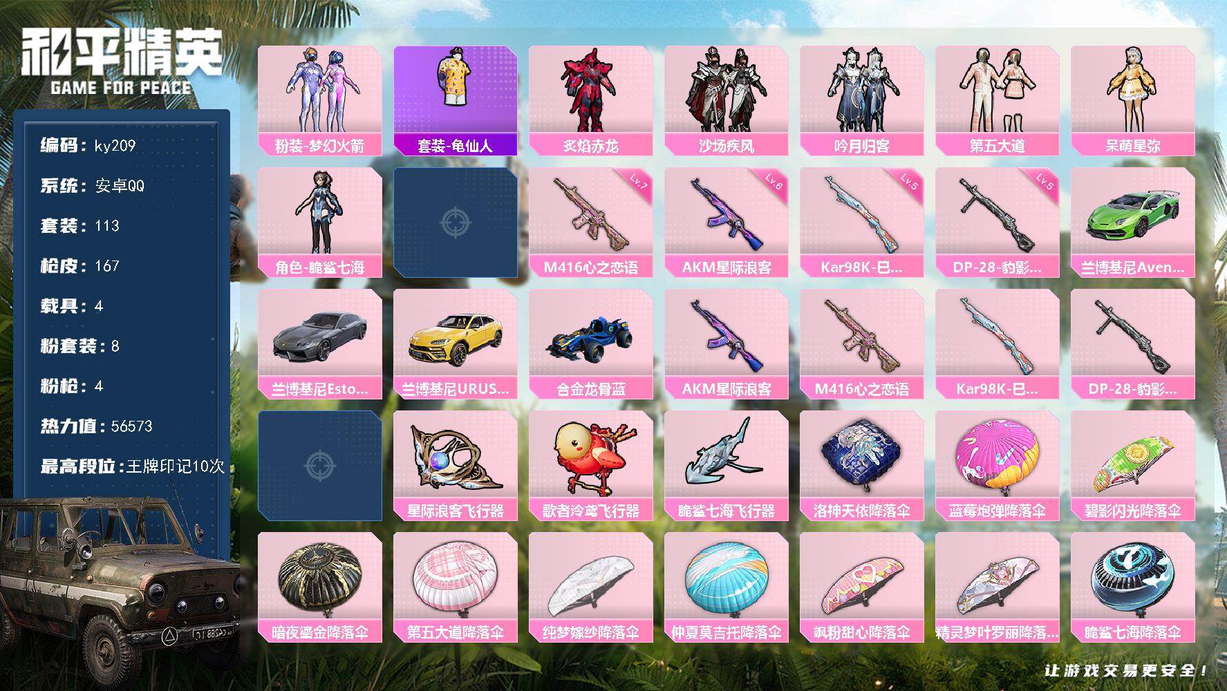 [17231386]安卓 手Q-8粉装-4特效枪-4载具-4粉色飞行器-56573热力值-10王牌印记-113套装-167枪皮