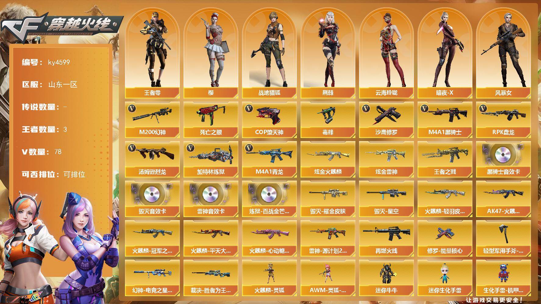 [17231528]山东一区-78V-3王者-2炫金 【热门武器】:M4A1-青龙,M200-幻神,死亡之眼,毒蜂,M4A1-黑骑士,汤姆逊-烈龙*2,RPK-盘龙,加特林-炼狱,COP-堕天神,沙鹰-修罗*4 【王者炫金武器】:王者之戮,炫金火麒麟,炫金雷神 【音效卡】:M4A1-雷神音效卡,M4A1-黑骑士音效卡,Barrett-毁灭音效卡,炼狱-百战金芒-庆典舞曲音效卡 【皮肤】:幻神-电竞之星 皮肤,裁决-胜者为王 皮肤,雷神-源计划2.0专属 皮肤,M4A1-再燃火线,火麒麟-冠军之心,AK47-火麒麟-传奇EVEN,火麒麟-轻羽皮肤,火麒麟-平天大圣,火麒麟-心动糖果,毁灭耀金皮肤,毁灭-星空,修罗-能量核心,轻型军用手斧-再燃火线 【角色】:樱,荆棘,战地猎狐,王者-零,云海玲珑,暗夜-X,风暴女,嘉年华灵狐,娟娟,麻雀,潘多拉-X,斯沃特-X,铁骑-乘风破浪,兔囡囡,新娜塔莎,雪莉杨,智影 【人偶武器】:火麒麟-灵狐,AWM-灵狐-15周年嘉年华,迷你牛牛*2,迷你生化手雷*2,生化手雷-机甲核心*3 【暴走生化】:毒蜂,死亡之眼,超级对讲机 【挑战大师】:激光毁灭者III-白马银枪 【英雄级武器】:AK47-火麒麟*2,M4A1-黑龙,M4A1-雷神*2,M4A1-黑骑士,AK47-无影*2,AK47-黑武士,AK12-天启,AK47-黑鲨,M4A1-龙血*2,M4A1-青龙,黑武士-锦绣游龙,M4A1-玫瑰精灵*3,王者之翼-觉醒版,AK-47-猩红传说,Barrett-毁灭*2,Barrett-极光,AWM-裁决,M200-幻神,Barrett-朱雀,王者之光-觉醒版,RPK-盘龙,加特林-炼狱,炼狱-百战金芒,汤姆逊-烈龙*2,沙鹰-修罗*4,沙鹰-天神,COP-堕天神,USP-冥王,屠龙,龙啸*2,马来剑-夜魔,擎天*2,擎天-云海游龙,麒麟刺-百战金芒,屠龙-云海游龙,丛林匕首-玄豹,高爆手雷-夜魔*3,高爆手雷-竞技荣光,手雷-云海游龙,高爆手雷-玄豹*2,闪光弹-夜魔*3,闪光弹-竞技荣光,闪光弹-玄豹,烟雾弹-夜魔*3,烟雾弹-竞技荣光*2,烟雾弹-玄豹,M4A1-赤狱骑士,M4A1-苍鸣雷神 【道具】:BS战队炫彩背包,CFS限定背包,炫彩背包-诺拉,炫彩背包,百战金芒炫彩背包,黑桃战神背包,女皇终结者-魔龙之吻,救世主-黑桃战神,绿色巨人,灵魂忍