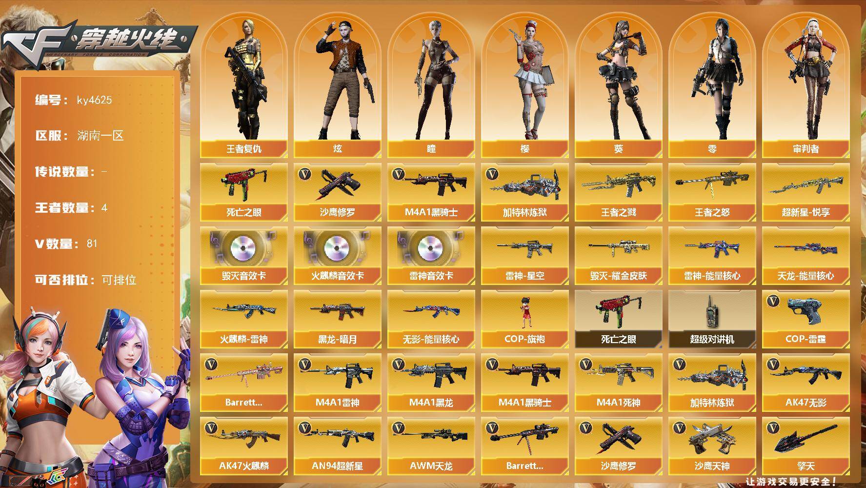 [17231766]湖南一区-81V-4王者-0炫金 【热门武器】:死亡之眼,M4A1-黑骑士,加特林-炼狱,沙鹰-修罗 【王者炫金武器】:王者之戮,超新星-悦享,王者之怒 【音效卡】:AK47-火麒麟音效卡,M4A1-雷神音效卡,Barrett-毁灭音效卡 【皮肤】:雷神-能量核心,雷神-星空,火麒麟-雷神,毁灭耀金皮肤,黑龙-暗月,无影-能量核心,天龙-能量核心 【角色】:零,葵,樱,瞳,炫,审判者,王者复仇,堕落女神,娟娟,兰-海滩派对,零-水下丽影,维纳斯,新娜塔莎 【人偶武器】:COP-旗袍 【暴走生化】:死亡之眼,超级对讲机 【英雄级武器】:AK47-火麒麟,M4A1-黑龙*2,M4A1-雷神*4,M4A1-黑骑士,AK47-无影*2,M4A1-死神,AN94-超新星,M4A1-武圣,AK47-黑鲨*4,M4A1-雷霆*2,M4A1-猎神*2,AWM-天龙,Barrett-毁灭,Barrett-金色蔷薇*4,加特林-炼狱,AA-12-雷霆*2,沙鹰-修罗,沙鹰-天神*3,COP-雷霆*2,王者之灵-觉醒版,屠龙*2,龙啸*8,擎天,麒麟刺*3,高爆手雷-雷霆*7,闪光弹-雷霆*7,烟雾弹-雷霆*7,M4A1-赤狱骑士 【道具】:亚洲杯纪念炫彩背包,炫彩背包,女皇终结者-魔龙之吻,救世主-黑桃战神,绿色巨人,灵魂忍者,变异宝贝,迷雾幽灵,夺命之镰,防化服*3,流光-鎏金之域,C4-黑曜,防弹头盔*3,防弹衣*3,C4工具钳*3,手雷包*3 【特殊枪械】:1黑骑士,1炼狱