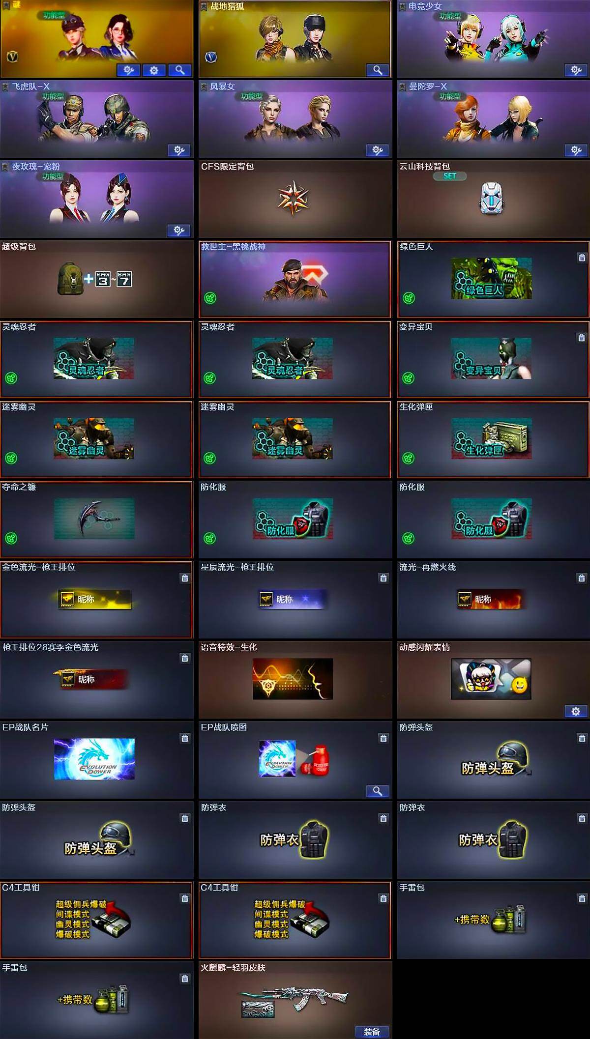 【道具】:CFS限定背包,云山科技背包,超级背包,救世主-黑桃战神,绿色巨人,灵魂忍者*2,变异宝贝,迷雾幽灵*2,生化弹匣,夺命之镰,防化服*2,金色流光-枪王排位,星辰流光-枪王排位,流光-再燃火线,枪王排位28赛季金色流光,语音特效-生化,动感闪耀表情,EP战队名片,EP战队喷图,防弹头盔*2,防弹衣*2,C4工具钳*2,手雷包*2