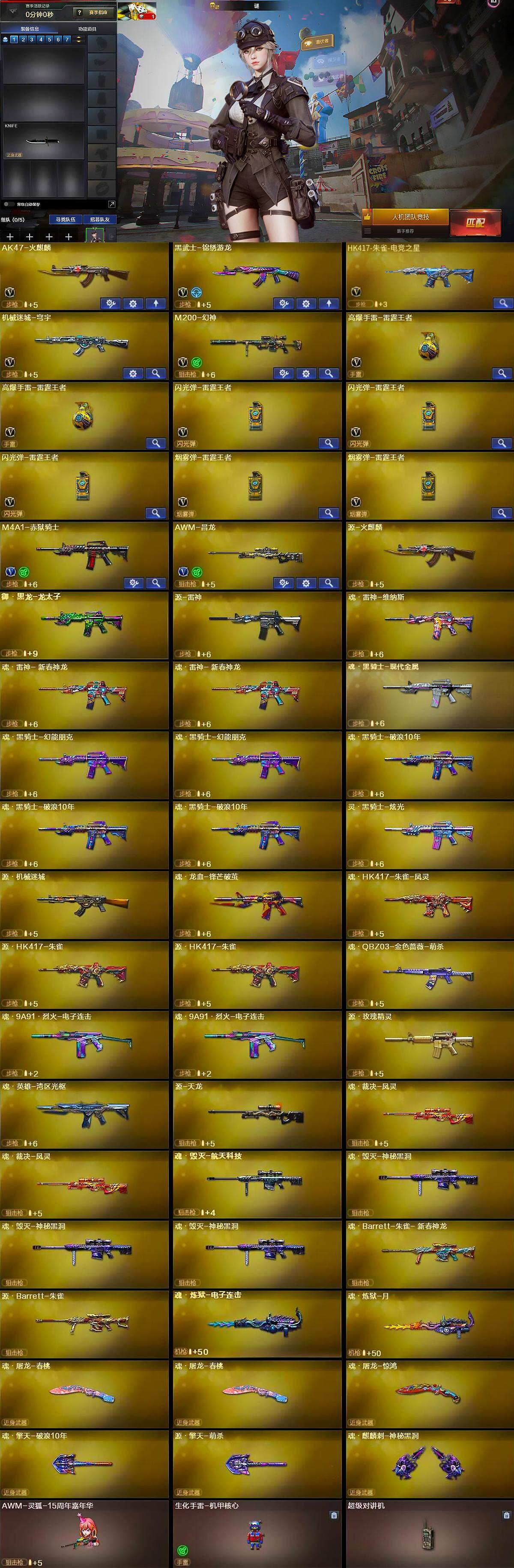 【英雄级武器】:AK47-火麒麟,黑武士-锦绣游龙,HK417-朱雀-电竞之星,机械迷城-穹宇,M200-幻神,高爆手雷-雷霆王者-觉醒版*2,闪光弹-雷霆王者-觉醒版*3,烟雾弹-雷霆王者-觉醒版*2,M4A1-赤狱骑士,AWM-昌龙