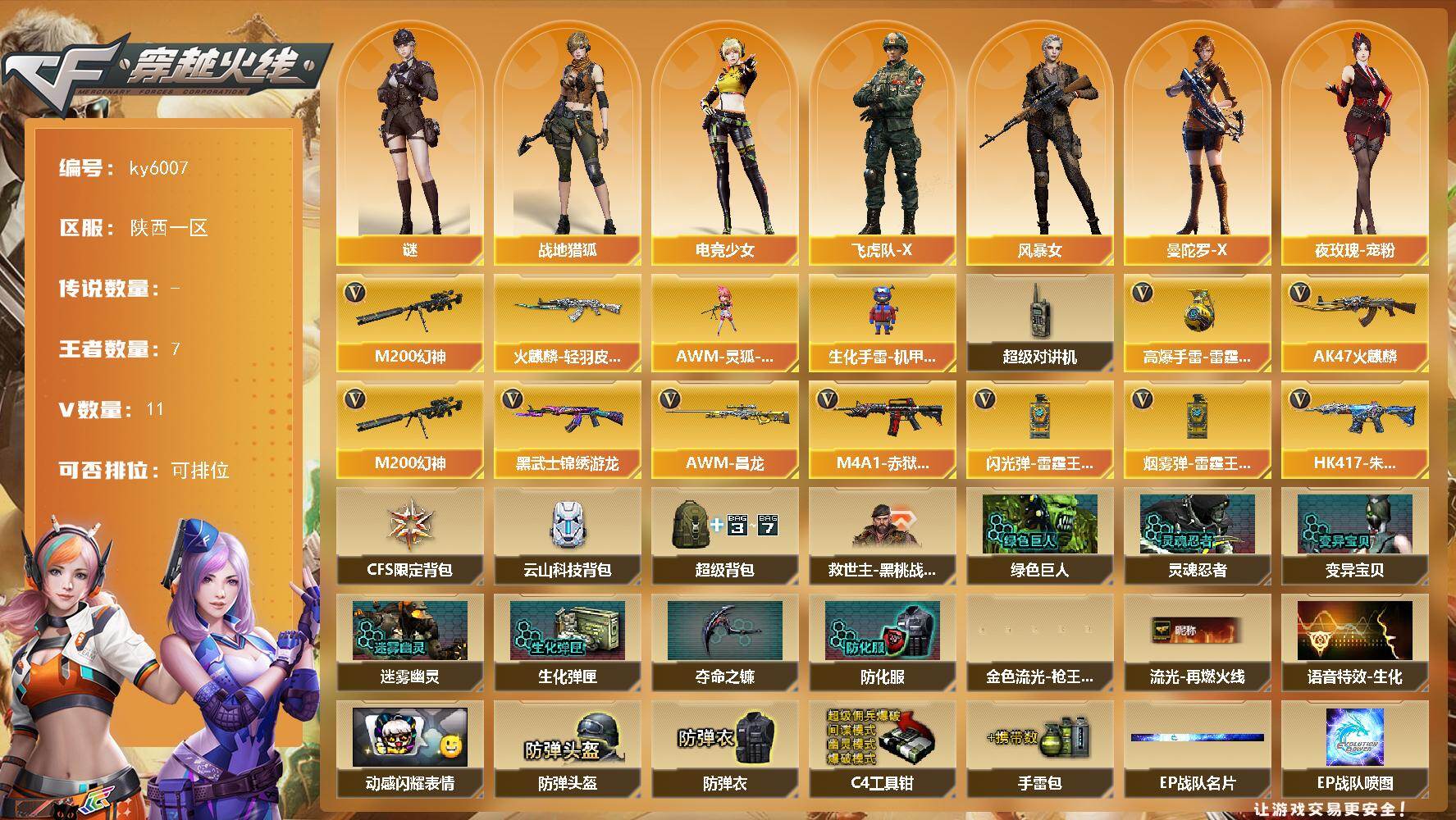 [17231980]陕西一区-17V-7王者武器数-0炫金武器数 【热门武器】:M200-幻神 【皮肤】:火麒麟-轻羽皮肤 【角色】:谜,战地猎狐,电竞少女,飞虎队-X,风暴女,曼陀罗-X,夜玫瑰-宠粉 【人偶武器】:AWM-灵狐-15周年嘉年华,生化手雷-机甲核心 【暴走生化】:超级对讲机 【英雄级武器】:AK47-火麒麟,黑武士-锦绣游龙,HK417-朱雀-电竞之星,机械迷城-穹宇,M200-幻神,高爆手雷-雷霆王者-觉醒版*2,闪光弹-雷霆王者-觉醒版*3,烟雾弹-雷霆王者-觉醒版*2,M4A1-赤狱骑士,AWM-昌龙 【道具】:CFS限定背包,云山科技背包,超级背包,救世主-黑桃战神,绿色巨人,灵魂忍者*2,变异宝贝,迷雾幽灵*2,生化弹匣,夺命之镰,防化服*2,金色流光-枪王排位,星辰流光-枪王排位,流光-再燃火线,枪王排位28赛季金色流光,语音特效-生化,动感闪耀表情,EP战队名片,EP战队喷图,防弹头盔*2,防弹衣*2,C4工具钳*2,手雷包*2 【特殊枪械】: