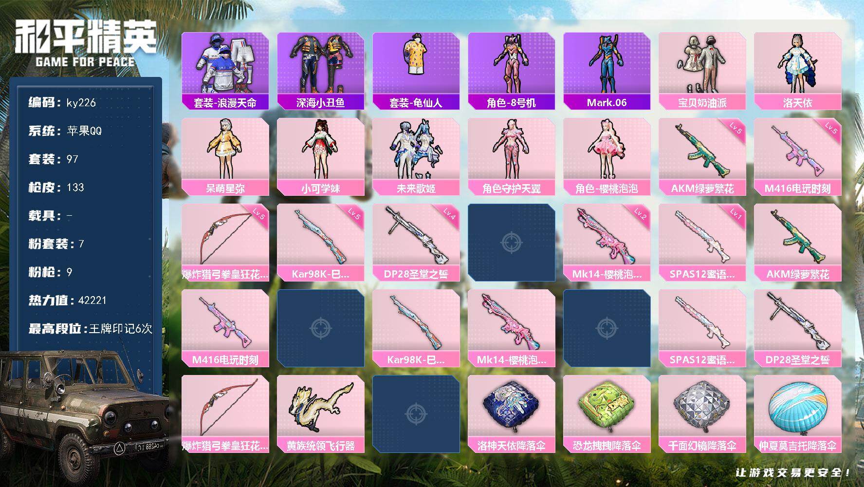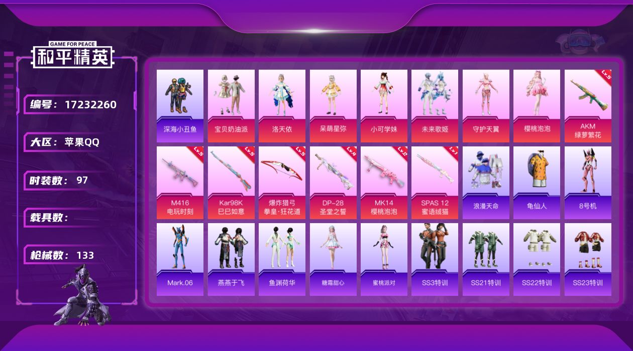 [17232260]苹果 手Q-7粉装-9特效枪-0载具-2粉色飞行器-42221热力值-6王牌印记-97套装-133枪皮