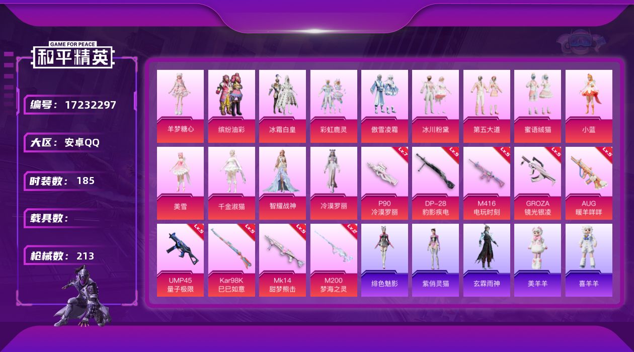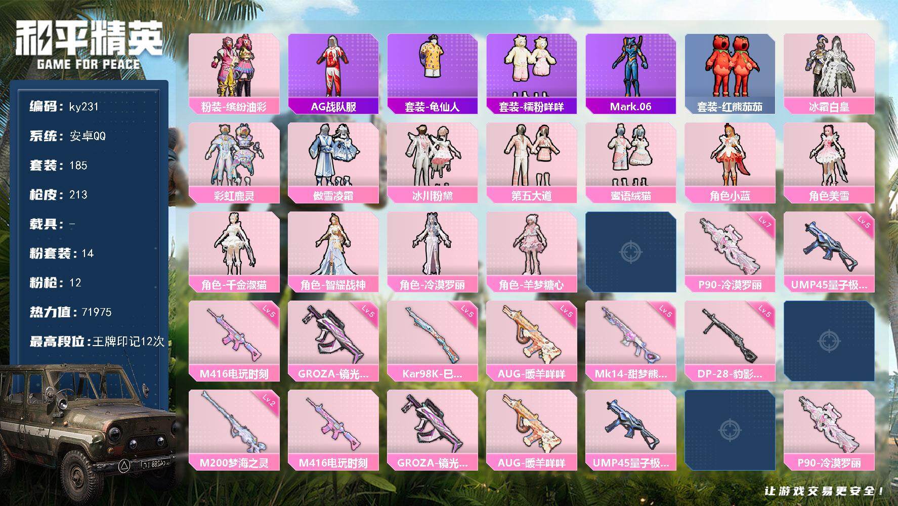 [17232297]安卓 手Q-14粉装-12特效枪-0载具-6粉色飞行器-71975热力值-12王牌印记-185套装-213枪皮