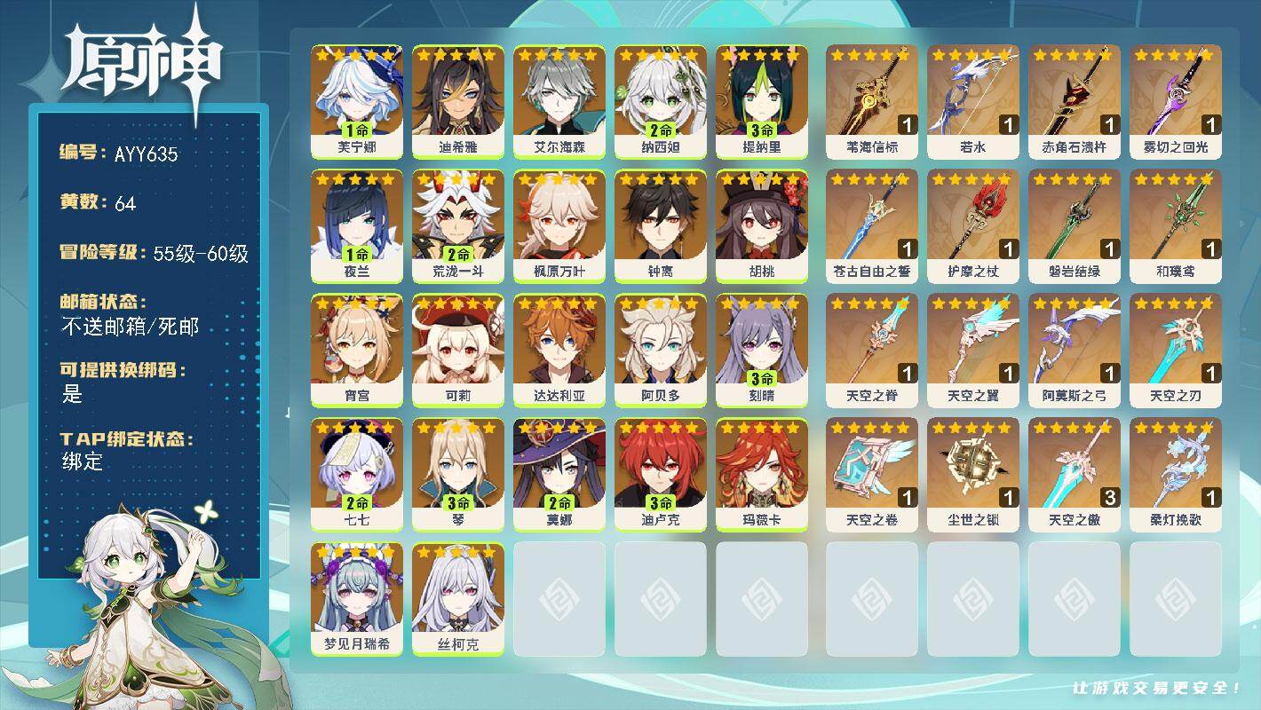 [17232889]60级/64黄/女主/22个五星角色/18个五星武器 1命芙宁娜,0命迪希雅,0命艾尔海森,2命纳西妲,3命提纳里,1命夜兰,2命荒泷一斗,0命枫原万叶,0命钟离,0命胡桃,0命宵宫,0命可莉,0命达达利亚,0命阿贝多,3命刻晴,2命七七,3命琴,2命莫娜,3命迪卢克,0命玛薇卡,0命梦见月瑞希,0命丝柯克,精1苇海信标,精1若水,精1赤角石溃杵,精1雾切之回光,精1苍古自由之誓,精1护摩之杖,精1磐岩结绿,精1和璞鸢,精1天空之脊,精1天空之翼,精1阿莫斯之弓,精1天空之刃,精1天空之卷,精1尘世之锁,精3天空之傲,精1柔灯挽歌