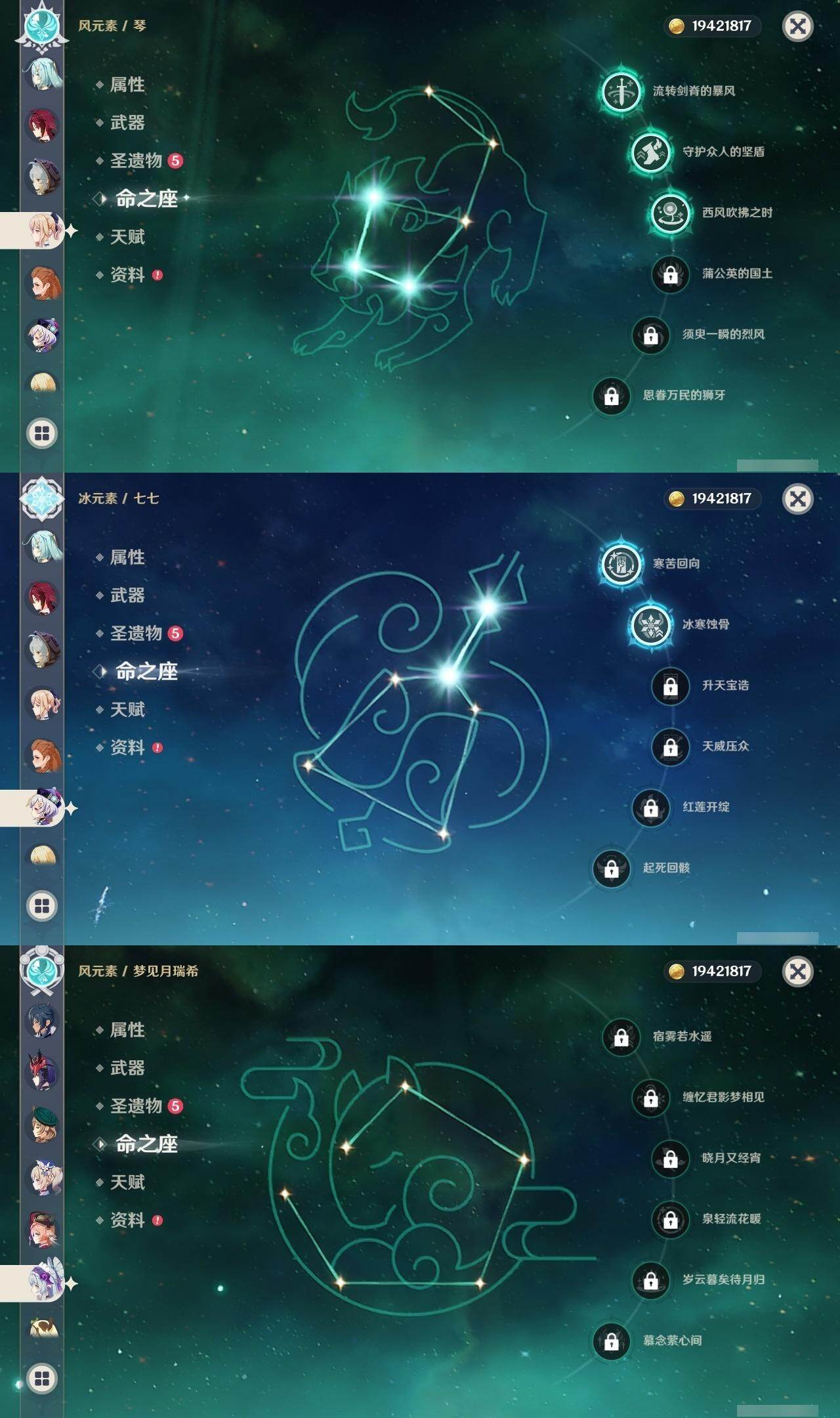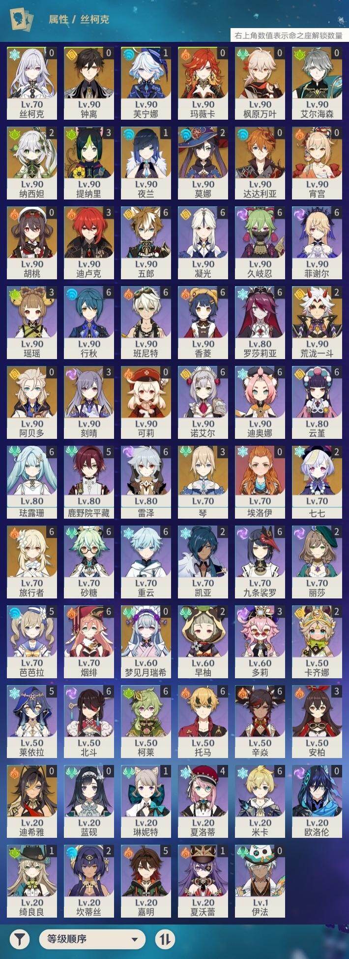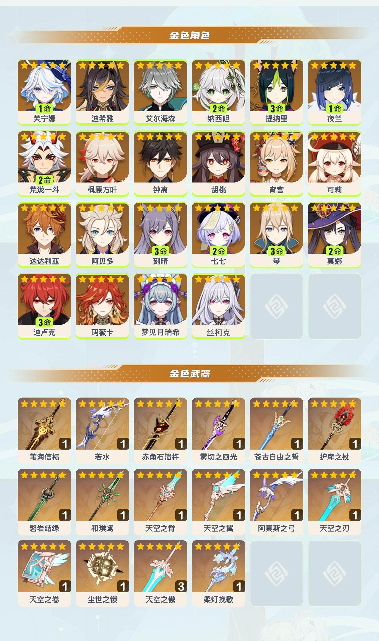 1命芙宁娜,0命迪希雅,0命艾尔海森,2命纳西妲,3命提纳里,1命夜兰,2命荒泷一斗,0命枫原万叶,0命钟离,0命胡桃,0命宵宫,0命可莉,0命达达利亚,0命阿贝多,3命刻晴,2命七七,3命琴,2命莫娜,3命迪卢克,0命玛薇卡,0命梦见月瑞希,0命丝柯克,精1苇海信标,精1若水,精1赤角石溃杵,精1雾切之回光,精1苍古自由之誓,精1护摩之杖,精1磐岩结绿,精1和璞鸢,精1天空之脊,精1天空之翼,精1阿莫斯之弓,精1天空之刃,精1天空之卷,精1尘世之锁,精3天空之傲,精1柔灯挽歌