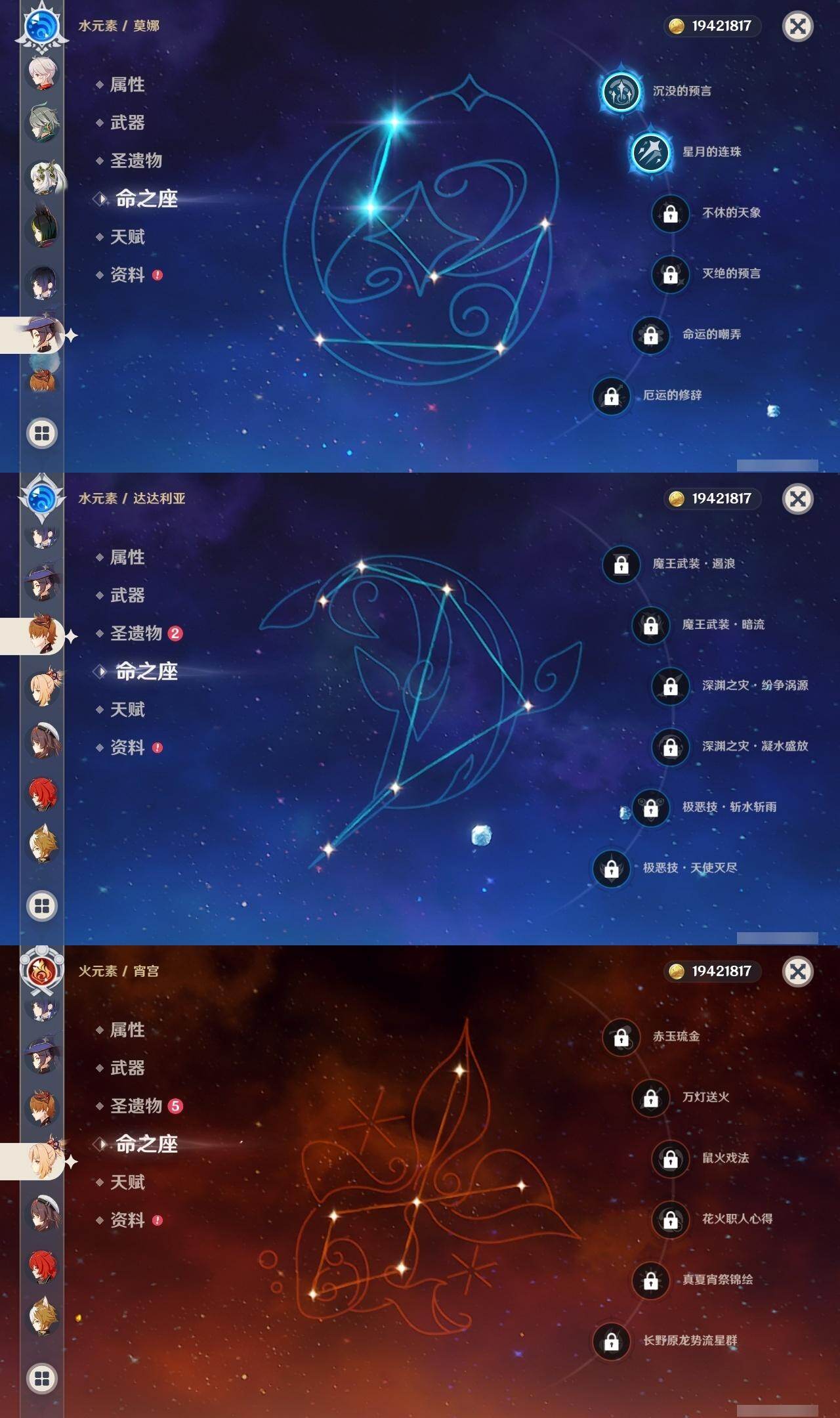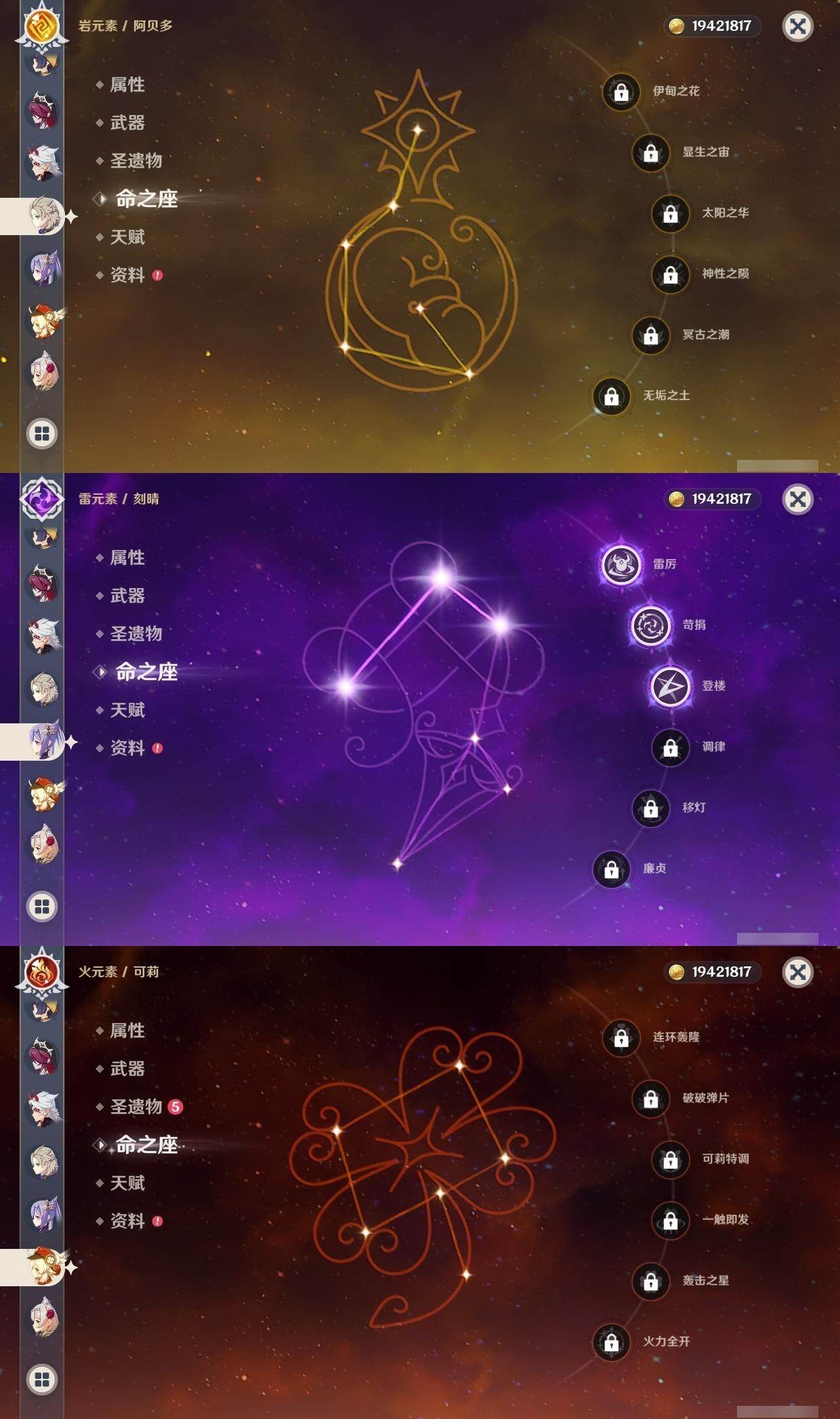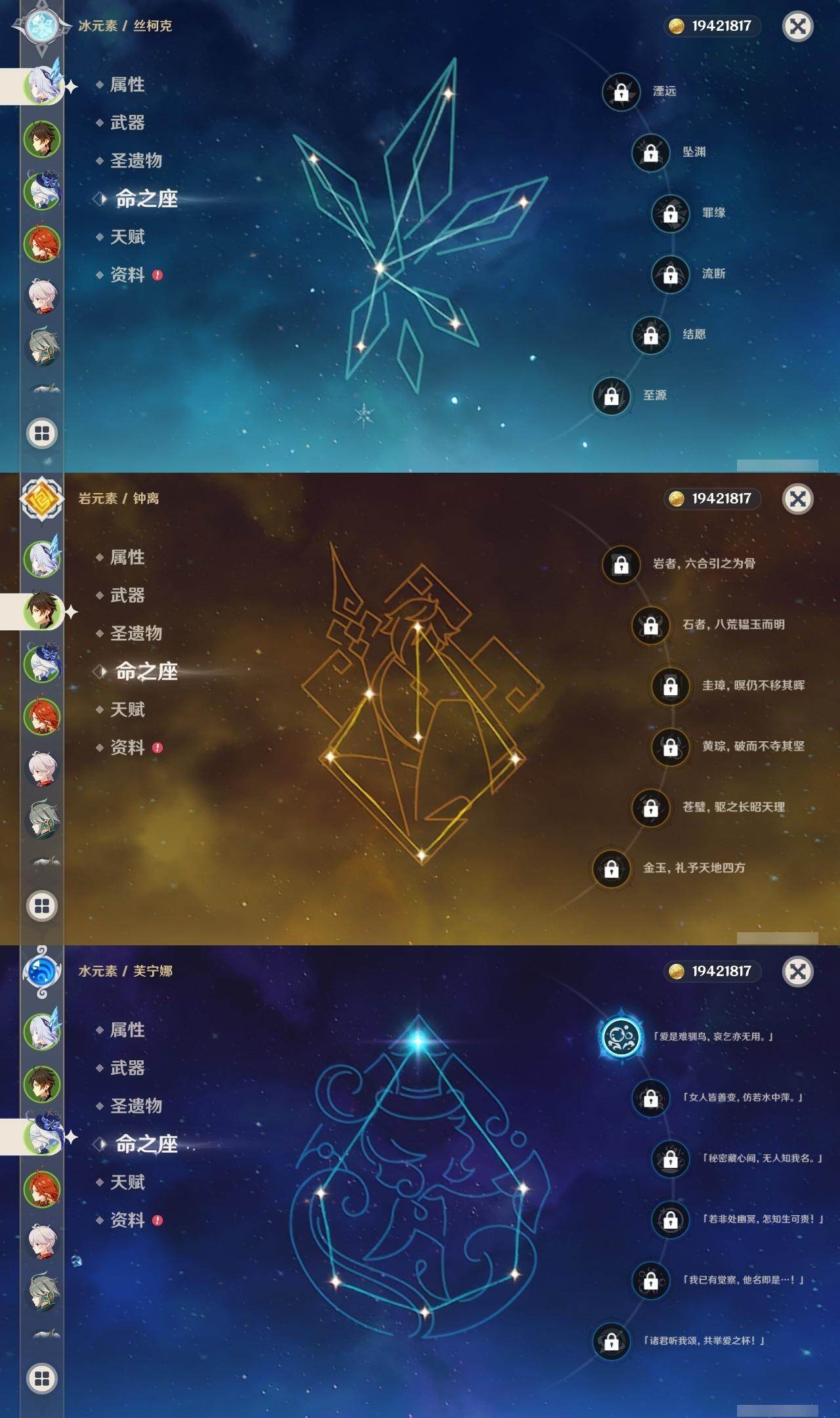 1命芙宁娜,0命迪希雅,0命艾尔海森,2命纳西妲,3命提纳里,1命夜兰,2命荒泷一斗,0命枫原万叶,0命钟离,0命胡桃,0命宵宫,0命可莉,0命达达利亚,0命阿贝多,3命刻晴,2命七七,3命琴,2命莫娜,3命迪卢克,0命玛薇卡,0命梦见月瑞希,0命丝柯克,精1苇海信标,精1若水,精1赤角石溃杵,精1雾切之回光,精1苍古自由之誓,精1护摩之杖,精1磐岩结绿,精1和璞鸢,精1天空之脊,精1天空之翼,精1阿莫斯之弓,精1天空之刃,精1天空之卷,精1尘世之锁,精3天空之傲,精1柔灯挽歌