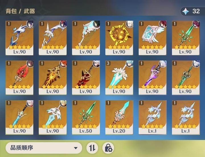 阿莫斯之弓,天空之翼,尘世之锁,天空之卷,和璞鸢,护摩之杖,天空之傲,磐岩结绿,苍古自由之誓,天空之刃,天空之脊