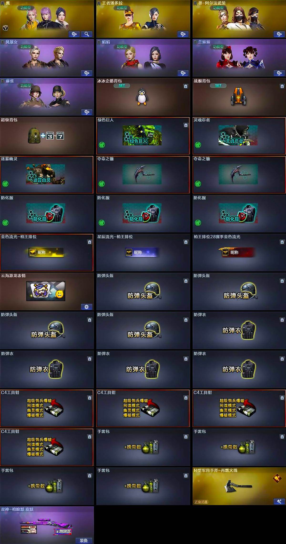 【道具】:冰冰企鹅背包,战舰背包,超级背包,绿色巨人,灵魂忍者,迷雾幽灵,夺命之镰*2,防化服*3,金色流光-枪王排位,星辰流光-枪王排位,枪王排位28赛季金色流光,云海游龙表情,防弹头盔*4,防弹衣*4,C4工具钳*4,手雷包*4