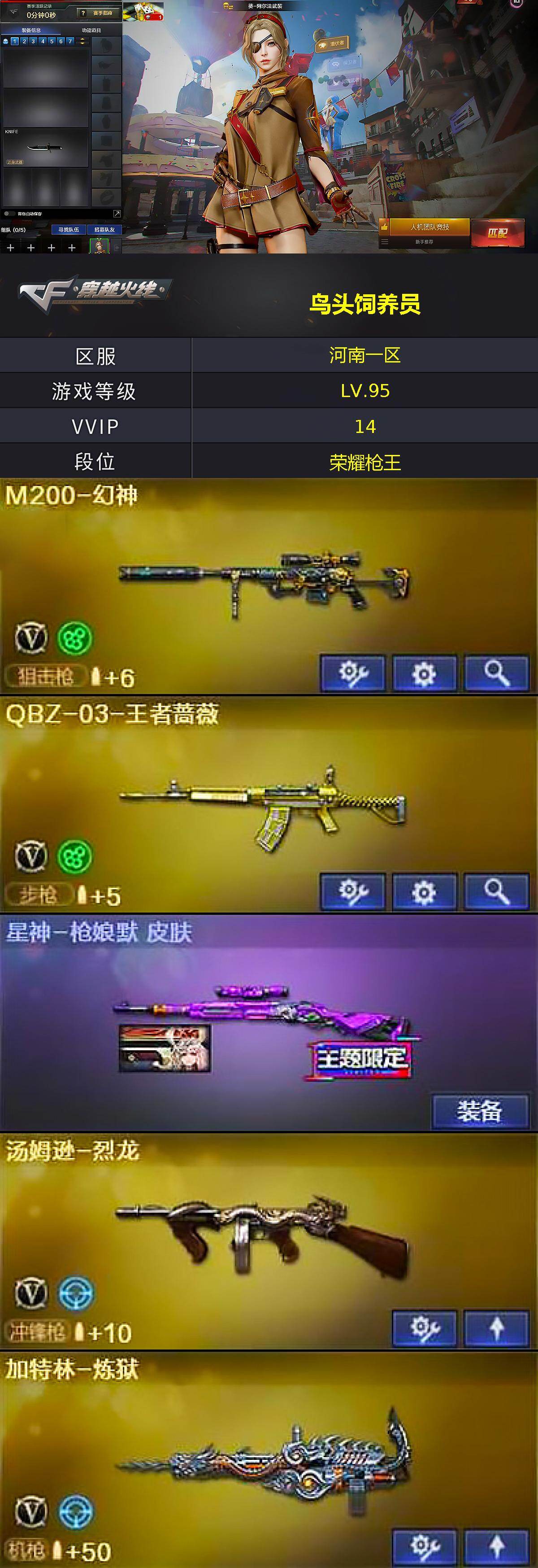 [17233055]河南一区-17V-2王者武器数-0炫金武器数 【热门武器】:M200-幻神,炼狱-迷你小钢,汤姆逊-烈龙,加特林-炼狱,沙鹰-修罗 【皮肤】:星神-枪娘默 皮肤,毁灭-英雄计划 皮肤,轻型军用手斧-再燃火线 【角色】:鹰,王者潘多拉,葵-阿尔法武装,风暴女,娟娟,兰妹妹,麻雀 【人偶武器】:天龙-曼陀罗,火麒麟-灵狐,炼狱-迷你小钢,斯泰尔-枪娘暗刃,迷你牛牛,生化手雷-机甲核心*3,灵狐娃娃手雷 【挑战大师】:AK47-冰龙粉碎者,激光毁灭者III-白马银枪 【英雄级武器】:AK47-火麒麟,QBZ-03-王者蔷薇-觉醒版,机械迷城-穹宇,Barrett-毁灭,M200-幻神,加特林-炼狱,汤姆逊-烈龙,沙鹰-修罗,屠龙,龙啸,擎天,麒麟刺,闪光弹-雷暴王者 【道具】:冰冰企鹅背包,战舰背包,超级背包,绿色巨人,灵魂忍者,迷雾幽灵,夺命之镰*2,防化服*3,金色流光-枪王排位,星辰流光-枪王排位,枪王排位28赛季金色流光,云海游龙表情,防弹头盔*4,防弹衣*4,C4工具钳*4,手雷包*4 【特殊枪械】:1烈龙,1炼狱