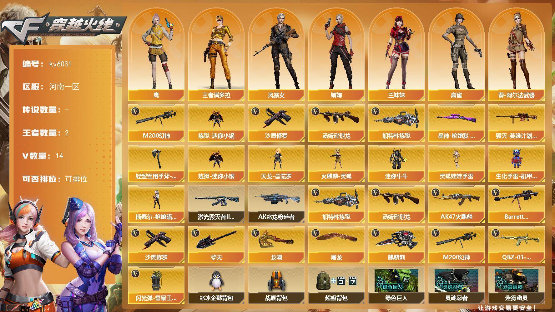 - [16785727]河南一区-99V-8王者-6炫金 【热门武器】:QBZ03-金色蔷薇*5,M4A1-青龙,M200-幻神,死亡之眼,M4A1-黑骑士*7,汤姆逊-烈龙*8,RPK-盘龙*8,加特林-炼狱*2,沙鹰-修罗*7 【王者炫金武器】:王者之幻,王者之武,王者之怒,王者之力,炫金骑士,炫金雷神*2,炫金武士,炫金毁灭*2 【音效卡】:AK47-火麒麟音效卡,M4A1-雷神音效卡,M4A1-黑骑士音效卡,Barrett-毁灭音效卡 【皮肤】:雷神-能量核心,雷神-荣耀之魄,雷神-星空,毁灭-荣耀之怒,黑骑士耀金皮肤,无影-暗月,无影-能量核心*2,无影耀金皮肤,战神-紫绶金章皮肤*3,战神-流金岁月皮肤*2,AWM-天龙-传奇70KG,极光-能量核心 【角色】:樱,战地猎狐,北极狐-X,风暴女,嘉年华灵狐,娟娟,灵狐者-黄金海岸,潘多拉-X,潜龙队-X,蛇姬,斯沃特-X,铁骑荣耀,新娜塔莎,夜玫瑰-宠粉,影武者-X 【人偶武器】:AWM-灵狐-15周年嘉年华,迷你裂空之翼*2,迷你牛魔王,迷你生化手雷,生化手雷-机甲核心,闪光弹-小乔 【暴走生化】:死亡之眼,超级对讲机 【挑战大师】:神圣爆裂者III,AK47-冰龙粉碎者,激光毁灭者III-白马银枪,VEPR-12-金魔,激光毁灭者III,神圣爆裂者-末日III*2,阐释者III*2 【英雄级武器】:AK47-火麒麟*5,M4A1-黑龙*2,M4A1-雷神*5,M4A1-黑骑士*7,AK47-无影,M4A1-死神,AK47-黑武士*3,AK12-天启*2,AN94-超新星*2,M4A1-武圣*2,AK47-黑鲨,M4A1-青龙,无影-神兵利器,QBZ03-金色蔷薇*5,王者之武-觉醒版,AK-47-猩红传说*5,AK47-B-战神,黑骑士-海王,AWM-天龙,Barrett-毁灭*3,Barrett-极光*2,AWM-裁决,M200-幻神,Barrett-金色蔷薇*4,RPK-盘龙*8,加特林-炼狱*2,汤姆逊-烈龙*8,AA-12-雷霆,沙鹰-修罗*7,沙鹰-天神*2,屠龙*4,龙啸,擎天,麒麟刺*4,闪光弹-雷霆王者-觉醒版,烟雾弹-雷霆王者-觉醒版,M4A1-赤狱骑士 【道具】:CFS限定背包,云山科技背包,全能枪王背包,炫彩背包,老虎背包,超级背包,女皇终结者-魔龙之吻,救世主-黑桃战神,绿色巨人,灵魂忍者,变异宝贝