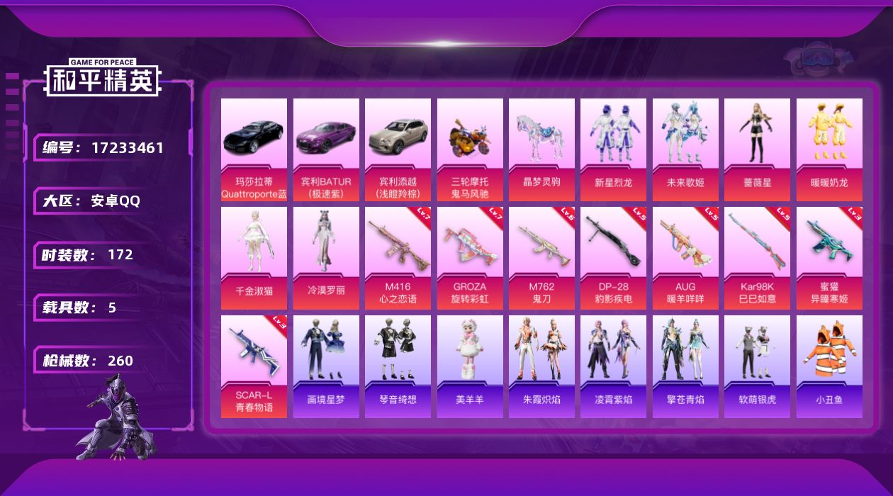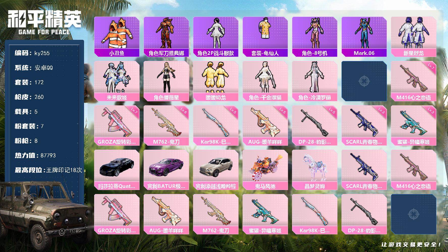 [17233461]安卓 手Q-7粉装-8特效枪-5载具-6粉色飞行器-87793热力值-18王牌印记-172套装-260枪皮