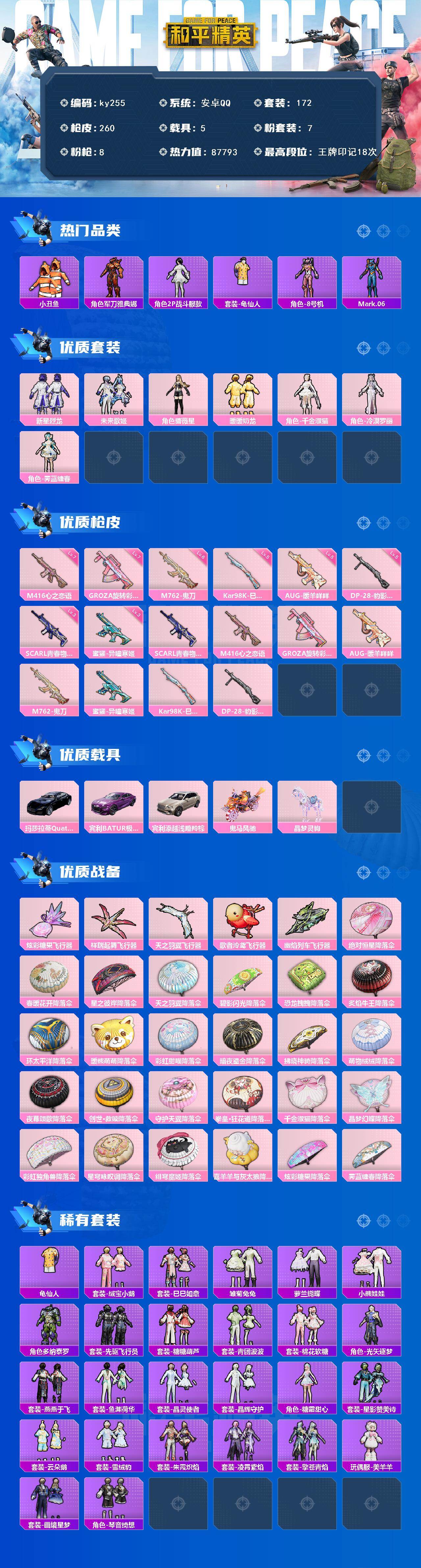 [17233461]安卓 手Q-7粉装-8特效枪-5载具-6粉色飞行器-87793热力值-18王牌印记-172套装-260枪皮 【热门品类】:套装-小丑鱼,角色-军刀雅典娜,角色-2P战斗服款,套装-龟仙人,角色-8号机,角色-Mark.06 【粉色套装】:粉装-新星烈龙,粉装-未来歌姬,角色-蔷薇星,粉装-暖暖奶龙,角色-千金淑猫,角色-冷漠罗丽,角色-霁蓝缠春 【粉色枪皮等级】:SCAR-L-青春物语(三级),M416-心之恋语(七级),GROZA-旋转彩虹(七级),AUG-暖羊咩咩(五级),M762-鬼刀(六级),蜜獾-异瞳寒姬(三级),Kar98K-巳巳如意(五级),DP-28-豹影疾电(五级) 【粉色载具】:玛莎拉蒂Quattroporte(夜幕蓝),宾利BATUR(极速紫),宾利添越(浅瞪羚棕),鬼马风驰,晶梦灵驹 【粉色枪皮】:SCAR-L-青春物语,M416-心之恋语,GROZA-旋转彩虹,AUG-暖羊咩咩,M762-鬼刀,蜜獾-异瞳寒姬,Kar98K-巳巳如意,DP-28-豹影疾电 【粉色飞行器】:炫彩糖果飞行器,祥瑞起舞飞行器,天之羽翼飞行器,歌者泠鸢飞行器,幽焰列车飞行器 【粉色降落伞】:绝对恒星降落伞,春暖花开降落伞,星之彼岸降落伞,天之羽翼降落伞,碧影闪光降落伞,恐龙拽拽降落伞,炙焰牛王降落伞,环太平洋降落伞,暖熊萌萌降落伞,彩虹甜喵降落伞,暗夜鎏金降落伞,拂晓神骑降落伞,萌物绒绒降落伞,夜幕颂歌降落伞,创世·救赎降落伞,守护天翼降落伞,拳皇·狂花道降落伞,千金淑猫降落伞,晶梦幻蝶降落伞,彩虹独角兽降落伞,星穹咏叹调降落伞,绯穹魔姬降落伞,喜羊羊与灰太狼降落伞,炫彩糖果降落伞,霁蓝缠春降落伞 【稀有套装】:套装-龟仙人,套装-绒宝小鹅,套装-巳巳如意,套装-雪国风尚,套装-炫彩糖果,套装-雏菊兔兔,套装-萝兰蝴蝶,套装-小熊娃娃,角色-多纳泰罗,套装-先驱飞行员,套装-糖糖葫芦,套装-青团波波,套装-棉花软糖,角色-光矢逐梦,套装-燕燕于飞,套装-鱼渊荷华,套装-晶灵使者,套装-晶辉守护,角色-糖霜甜心,套装-星影赞美诗,套装-云朵鹅,套装-雪绒豹,套装-朱霞炽焰,套装-凌霄紫焰,套装-擎苍青焰,玩偶服-美羊羊,套装-画境星梦,套装-琴音绮想 【稀有枪皮】:AKM-2P战斗服款,AKM-夜灯,AKM-彩虹符号,AKM-生命誓言,AKM-破晓战魂,AKM-虎虎