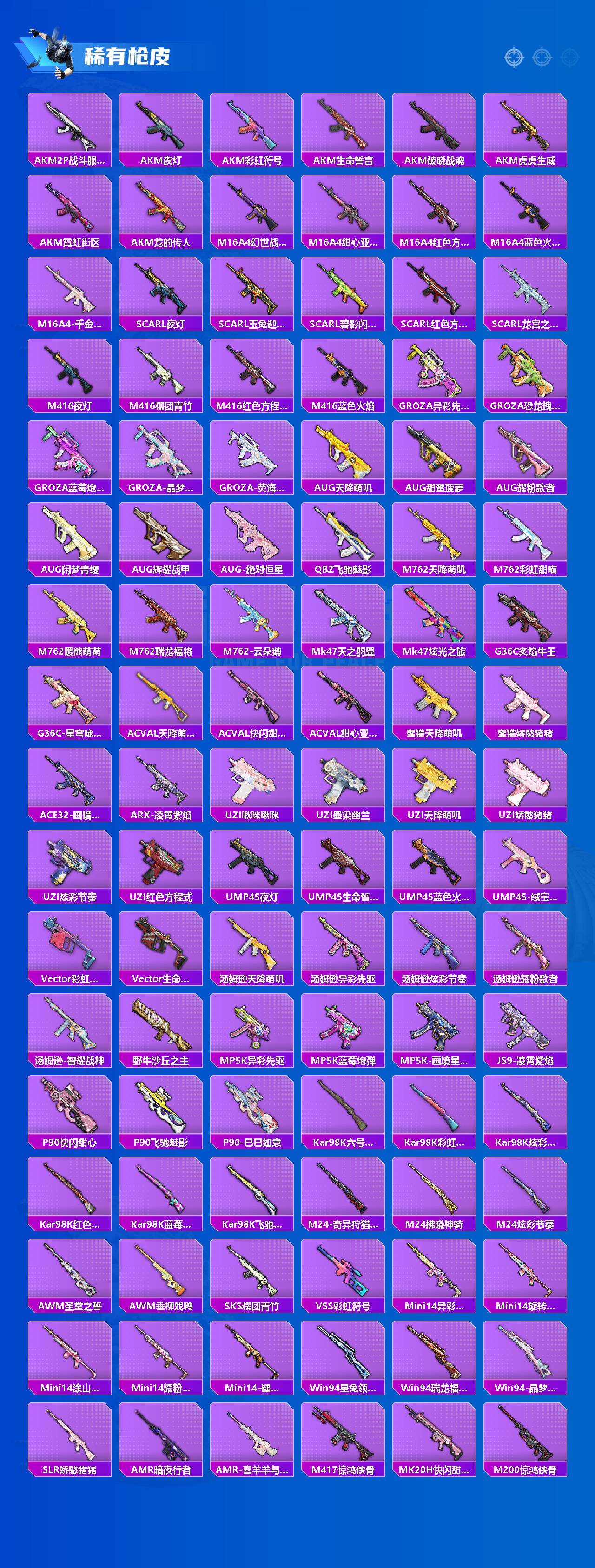 【稀有枪皮】:AKM-2P战斗服款,AKM-夜灯,AKM-彩虹符号,AKM-生命誓言,AKM-破晓战魂,AKM-虎虎
