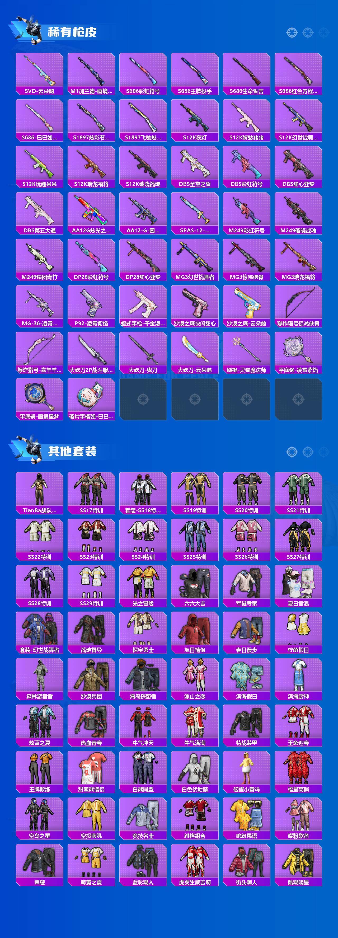 - [16335740]【特价出售/店主推荐】126m总资产-18689k哈伏币-60烽火等级-钻石-22战场等级-上等兵 【干员外观】:露娜-金牌射手 【近战皮肤】:近战-信条,近战-黑鹰 【传说外观】:SG552突击步枪-运动员,P90冲锋枪-信条,SR-25射手步枪-信条 【史诗外观】:QBZ95-1突击步枪-曙光,K416突击步枪-冬日风情,M7战斗步枪-百步穿杨,G3战斗步枪-流沙送葬,AS Val突击步枪-百步穿杨,MP5冲锋枪-竞技风,Vector冲锋枪-百步穿杨,SVD狙击步枪-阿萨拉工艺,M700狙击步枪-百步穿杨,AWM狙击步枪-流沙送葬 【稀有外观】:M4A1突击步枪-繁盛,AKM突击步枪-肃杀,ASh-12战斗步枪-繁盛,AUG突击步枪-前沿科技,M7战斗步枪-前沿科技,SG552突击步枪-2026,MP5冲锋枪-哈夫克卫队,SMG-45-行动开启,勇士冲锋枪-主宰,勇士冲锋枪-冰天雪地,M249轻机枪-冰天雪地,Mini-14射手步枪-荣耀列队,PSG-1射手步枪-主宰 【普通外观】:腾龙突击步枪-古铜*2,M7战斗步枪-噬菌体,M4A1突击步枪-粉色涂装,QBZ95-1突击步枪-海浪,K416突击步枪-高雅黑,M16A4突击步枪-高雅黑,AUG突击步枪-浅蓝涂装,M7战斗步枪-红色涂装,SG552突击步枪-浅蓝涂装,SG552突击步枪-海浪,AK-12突击步枪-变色龙,G3战斗步枪-高雅黑,CAR-15突击步枪-变色龙,K437突击步枪-磐石,MP5冲锋枪-黄蜂,野牛冲锋枪-高雅黑,SR-3M紧凑突击步枪-变色龙,M1014霰弹枪-高雅黑,M1014霰弹枪-海浪,M1014霰弹枪-变色龙,QJB201轻机枪-磐石,SVD狙击步枪-高雅黑,SR-25射手步枪-黄蜂,SR9射手步枪-磐石,SV-98狙击步枪-红色涂装,R93狙击步枪-变色龙,沙漠之鹰-海浪,沙漠之鹰-高雅黑 【挂饰】:挂饰-窃风密探,挂饰-信条,挂饰-崩岩重炮*2,挂饰-暗行哨兵*3,挂饰-聚宝盆*2,挂饰-雪人,挂饰-牛角,挂饰-关山难越,挂饰-紧急撤离*9,挂饰-麻将