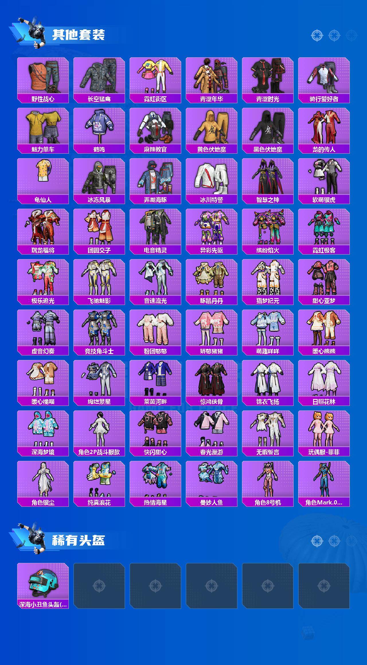 【稀有套装】:套装-龟仙人,套装-绒宝小鹅,套装-巳巳如意,套装-雪国风尚,套装-炫彩糖果,套装-雏菊兔兔,套装-萝兰蝴蝶,套装-小熊娃娃,角色-多纳泰罗,套装-先驱飞行员,套装-糖糖葫芦,套装-青团波波,套装-棉花软糖,角色-光矢逐梦,套装-燕燕于飞,套装-鱼渊荷华,套装-晶灵使者,套装-晶辉守护,角色-糖霜甜心,套装-星影赞美诗,套装-云朵鹅,套装-雪绒豹,套装-朱霞炽焰,套装-凌霄紫焰,套装-擎苍青焰,玩偶服-美羊羊,套装-画境星梦,套装-琴音绮想