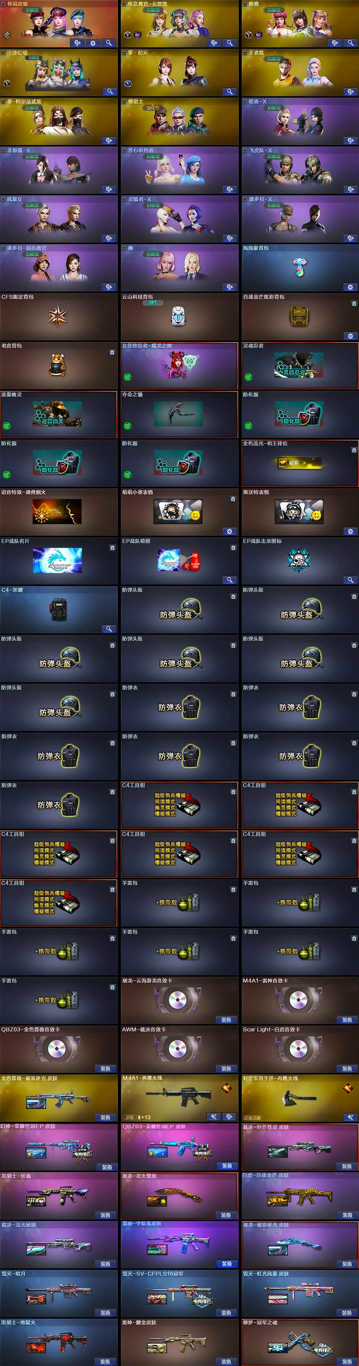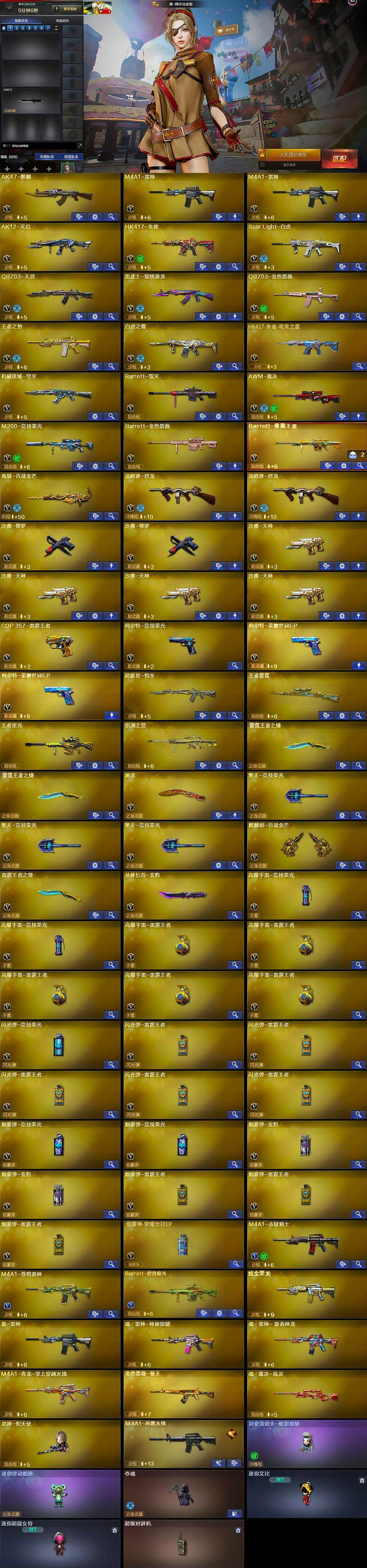 【英雄级武器】:AK47-麒麟,M4A1-雷神*2,AK12-天启,HK417-朱雀,Scar Light-白虎,QBZ03-天罚,黑武士-锦绣游龙,QBZ03-金色蔷薇,王者之势-觉醒版,白虎之魄-觉醒版,HK417-朱雀-电竞之星,机械迷城-穹宇,Barrett-毁灭,AWM-裁决,M200-竞技荣光,Barrett-金色蔷薇,Barrett-雷霆王者-觉醒版,炼狱-百战金芒,汤姆逊-烈龙*2,沙鹰-修罗*2,沙鹰-天神*4,COP 357-雷霆王者-觉醒版,柯尔特-竞技荣光,柯尔特-荣耀世冠EP*2,屠龙,擎天-竞技荣光*3,麒麟刺-百战金芒,雷霆王者之锋-觉醒版,丛林匕首-玄豹,高爆手雷-竞技荣光*2,高爆手雷-雷霆王者-觉醒版*5,闪光弹-竞技荣光,闪光弹-雷霆王者-觉醒版*5,烟雾弹-竞技荣光*2,烟雾弹-玄豹*2,烟雾弹-雷霆王者-觉醒版*3,烟雾弹-荣耀世冠EP,M4A1-赤狱骑士,M4A1-苍鸣雷神,Barrett-碧霄极光