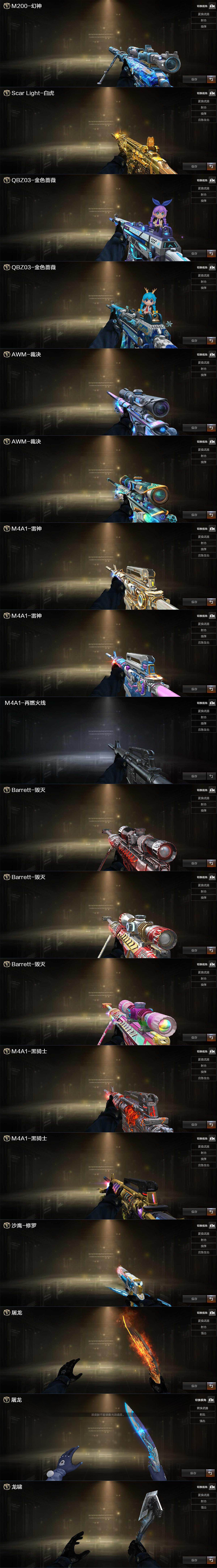 【音效卡】:屠龙-云海游龙音效卡,M4A1-雷神音效卡,QBZ03-金色蔷薇音效卡,AWM-裁决音效卡,Scar Light-白虎音效卡