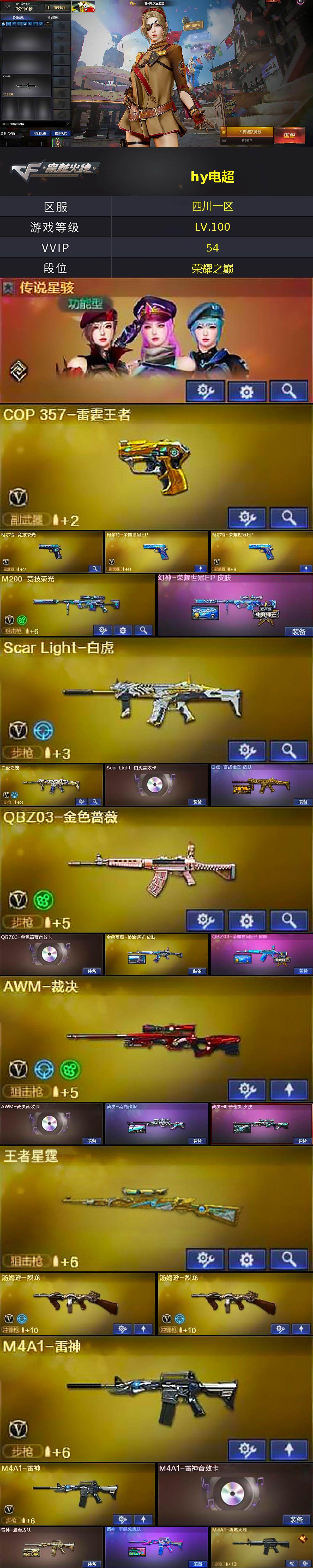 [17233595]四川一区-72V-24王者武器数-1炫金武器数 【传说角色】:传说星骇 【热门武器】:QBZ03-金色蔷薇,Scar Light-白虎,HK417-朱雀,M200-竞技荣光,汤姆逊-烈龙*2,沙鹰-修罗*2 【王者炫金武器】:超新星-悦享,王者星霆,王者星光,炽渊之怒,雷霆王者之锋*2,炫金黑龙 【音效卡】:屠龙-云海游龙音效卡,M4A1-雷神音效卡,QBZ03-金色蔷薇音效卡,AWM-裁决音效卡,Scar Light-白虎音效卡 【皮肤】:幻神-荣耀世冠EP 皮肤,白虎-百战金芒 皮肤,金色蔷薇-破浪逐光 皮肤,QBZ03-荣耀世冠EP 皮肤,裁决-流光秘银,裁决-叶芒苍灵 皮肤,雷神-耀金皮肤,雷神-宇航兔皮肤,M4A1-再燃火线,毁灭-暗月,毁灭-SV-CFPLS16冠军,毁灭-虹光风暴 皮肤,黑骑士-地狱火,黑骑士-伏羲,修罗-冠军之魂,屠龙-星火燎原,屠龙-破浪逐光 皮肤,轻型军用手斧-再燃火线 【角色】:电竞教官-云悠悠,晴雅,迅捷虹喵,零·纪元,王者炫,修道士,葵-阿尔法武装,暗夜-X,北极狐-X,芳心审判者,飞虎队-X,风暴女,兰-新年限定,灵狐者-X,潘多拉-X,潘多拉-甜心教官,幽 【人偶武器】:星神-炽天使,异变清道夫-蛇影双骄,迷你律动酷熊,夺魂,迷你艾比,迷你超能女侍 【暴走生化】:超级对讲机 【英雄级武器】:AK47-麒麟,M4A1-雷神*2,AK12-天启,HK417-朱雀,Scar Light-白虎,QBZ03-天罚,黑武士-锦绣游龙,QBZ03-金色蔷薇,王者之势-觉醒版,白虎之魄-觉醒版,HK417-朱雀-电竞之星,机械迷城-穹宇,Barrett-毁灭,AWM-裁决,M200-竞技荣光,Barrett-金色蔷薇,Barrett-雷霆王者-觉醒版,炼狱-百战金芒,汤姆逊-烈龙*2,沙鹰-修罗*2,沙鹰-天神*4,COP 357-雷霆王者-觉醒版,柯尔特-竞技荣光,柯尔特-荣耀世冠EP*2,屠龙,擎天-竞技荣光*3,麒麟刺-百战金芒,雷霆王者之锋-觉醒版,丛林匕首-玄豹,高爆手雷-竞技荣光*2,高爆手雷-雷霆王者-觉醒版*5,闪光弹-竞技荣光,闪光弹-雷霆王者-觉醒版*5,烟雾弹-竞技荣光*2,烟雾弹-玄豹*2,烟雾弹-雷霆王者-觉醒版*3,烟雾弹-荣耀世冠EP,M4A1-赤狱骑士,M4A1-苍鸣雷神,Barrett-碧霄极光 【道