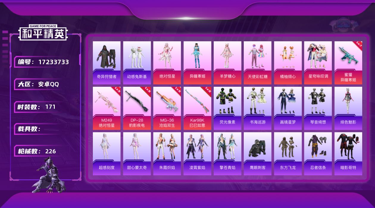 - PX_2091224- 安卓手Q-13王牌印记-2粉装-5特效枪-0载具-53322热力值-123套装-169枪皮-4卓越印记-2传奇印记 【2粉装】,玩偶服-猪猪侠,月影灵韵 【5特效枪】GROZA-镜光银凌-5级 AUG-暖羊咩咩-5级 M762-青锋波束-5级 Kar98K-巳巳如意-5级 Mk14-甜梦熊击-5级 【3稀有紫装】,浪漫天命,雪山精英,龟仙人, 【123稀有时装】,SS31