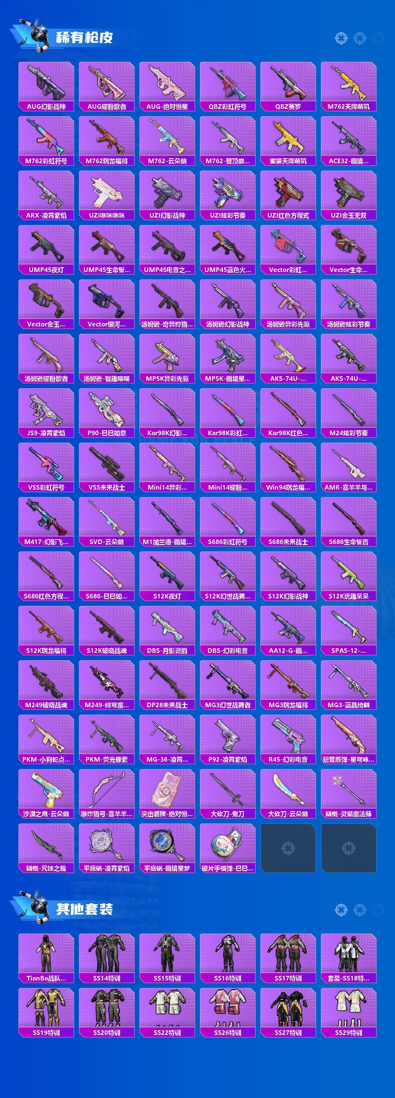 【稀有枪皮】:M79短管榴弹-钛晶裂爪,MP5K-天马神君,Mini14-天马神君,ARX-天马神君,AUG-冰晶雪宝,AKM-夜灯,AKM-彩虹符号,AKM-灼热熔岩,AKM-破晓战魂,AKM-霓虹街区,AKM-灵猫魔法师,M16A4-幻世战舞者,M16A4-红色方程式,M16A4-蓝色火焰,SCAR-L-夜灯,SCAR-L-未来战士,SCAR-L-炫彩节奏
