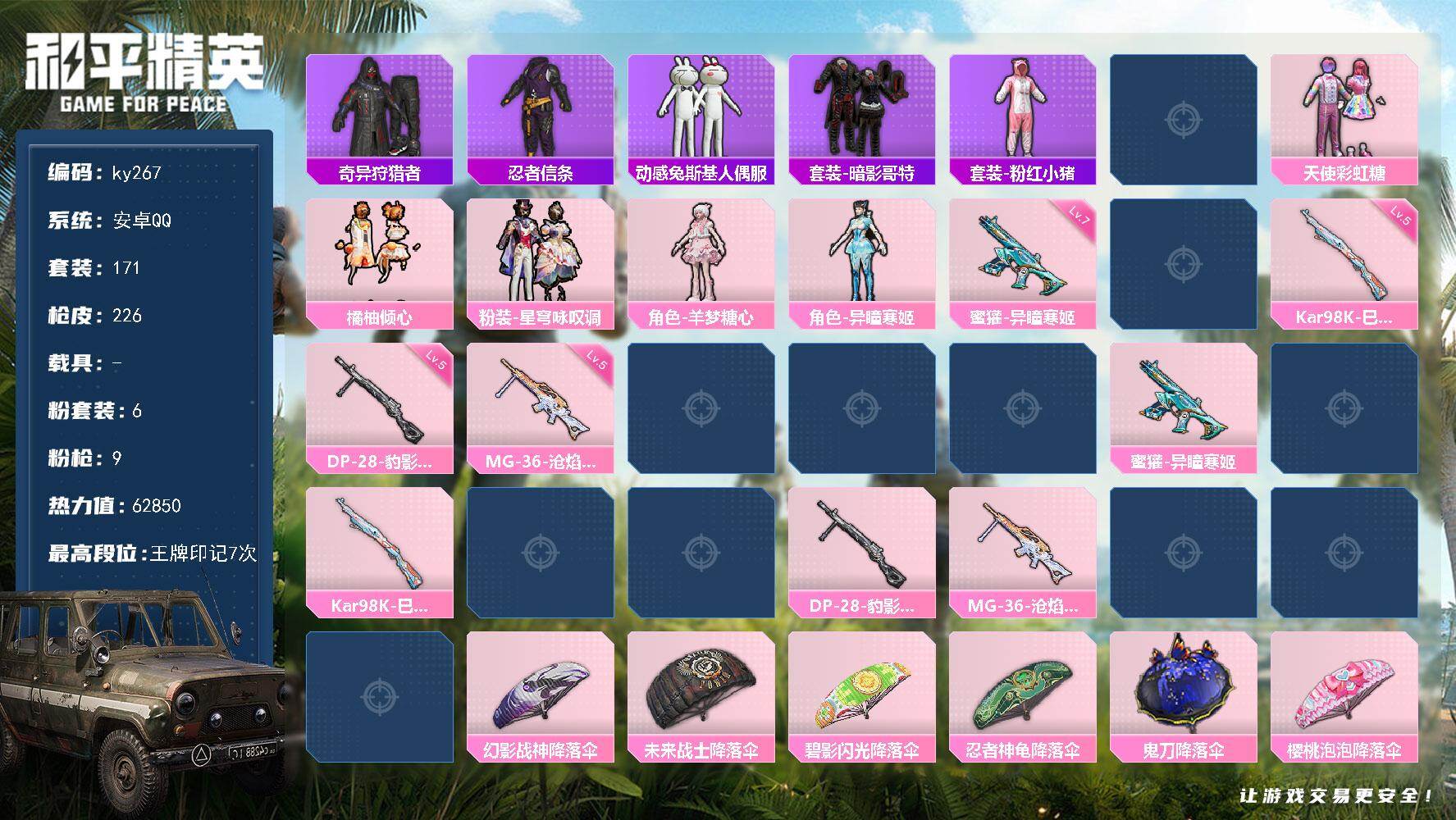 [17233733]安卓 手Q-6粉装-9特效枪-0载具-2粉色飞行器-62850热力值-7王牌印记-171套装-226枪皮