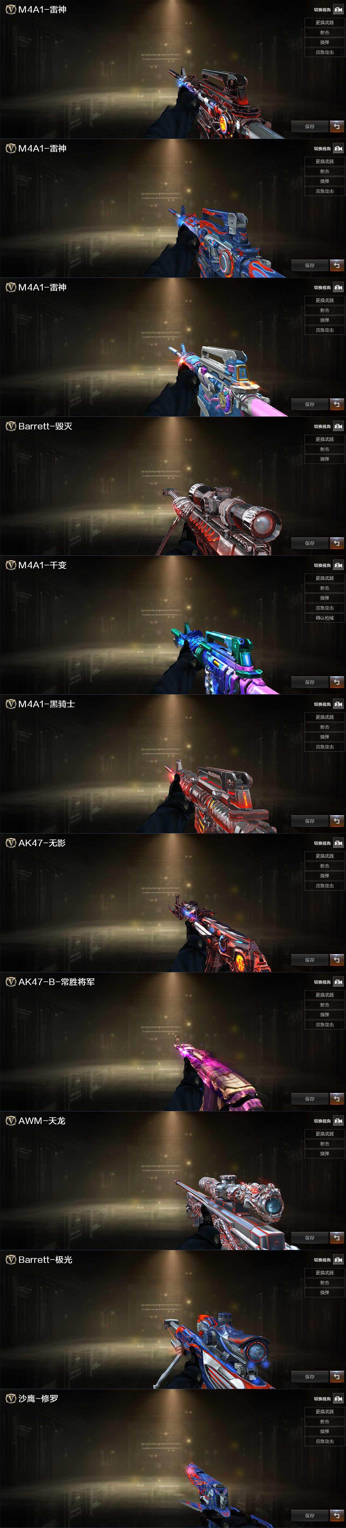 【英雄级武器】:M4A1-千变,AK47-火麒麟*3,M4A1-黑龙,M4A1-雷神*8,M4A1-黑骑士*2,AK47-无影,M4A1-死神*2,AK47-黑武士,AK12-天启,AN94-超新星*3,M4A1-武圣,黑武士-锦绣游龙,死神-雪域霜狐,M4A1-玫瑰精灵,QBZ95-幻兽,QBZ03-金色蔷薇*2,M4A1-猎神,王者之魄-觉醒版,AK-47-猩红传说,机械迷城-穹宇,AWM-天龙*2,Barrett-毁灭*4,Barrett-极光*3,AWM-裁决,Barrett-金色蔷薇*2,王者之光-觉醒版,RPK-盘龙,加特林-炼狱*3,汤姆逊-烈龙*8,沙鹰-修罗*7,沙鹰-天神*2,沙鹰-幻
