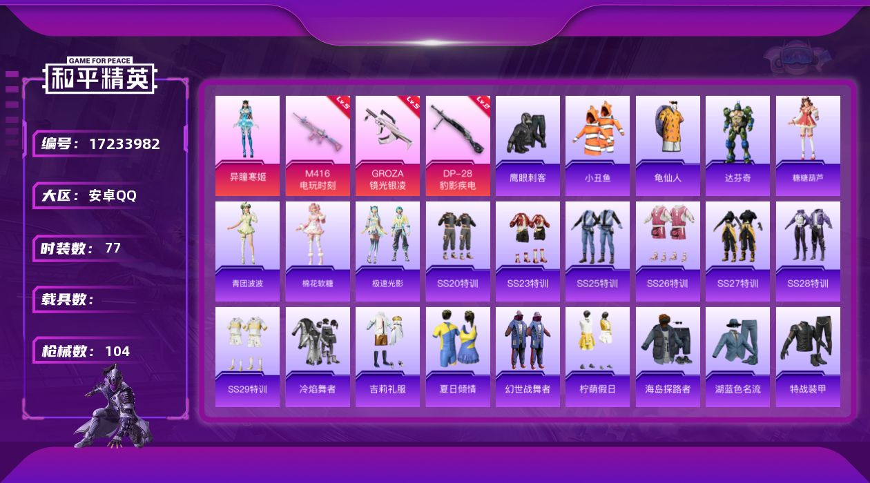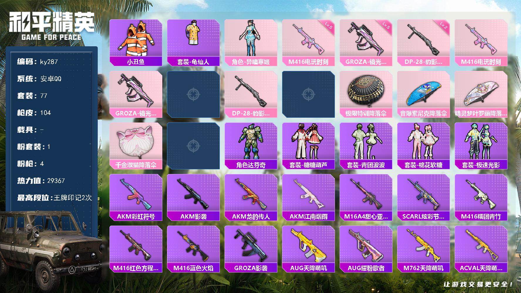 [17233982]安卓 手Q-1粉装-4特效枪-0载具-1粉色飞行器-29367热力值-2王牌印记-77套装-104枪皮