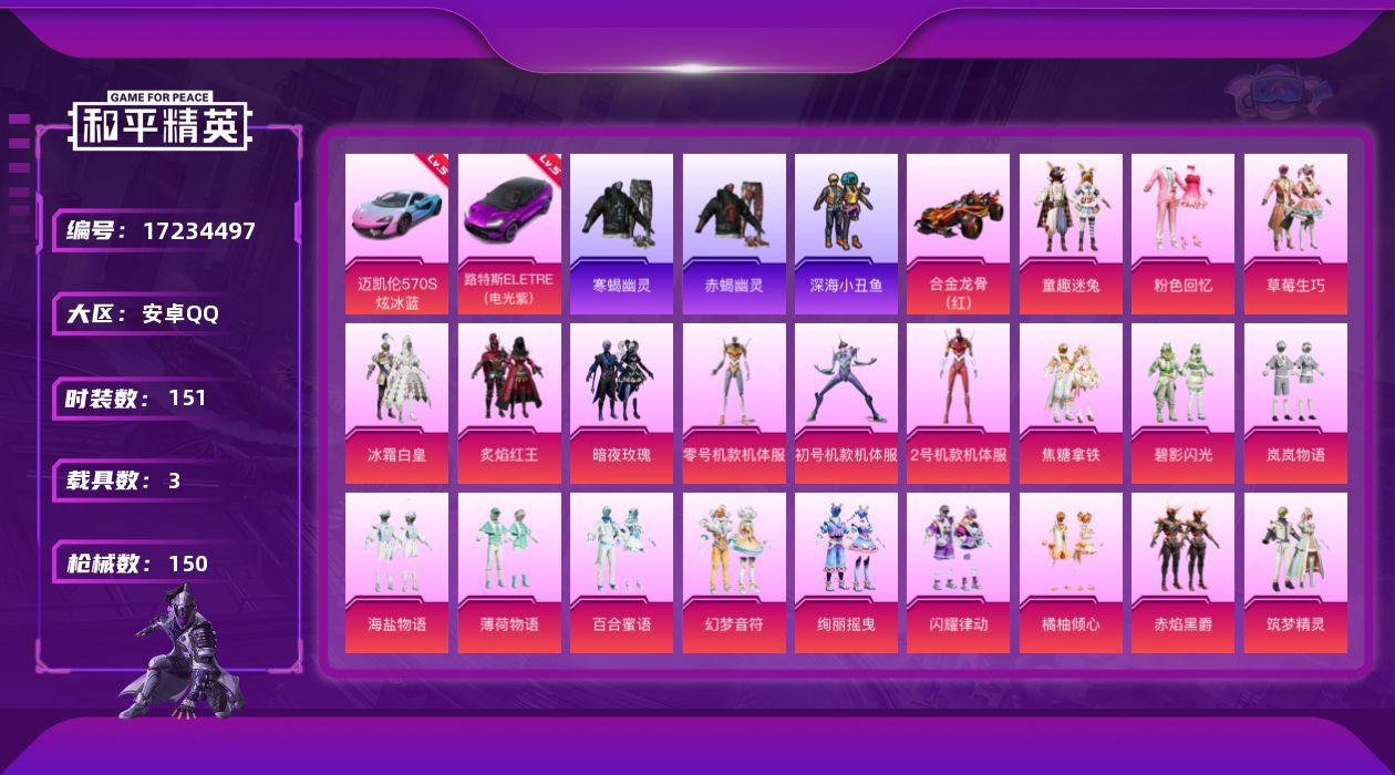 [17234497]安卓 手Q-26粉装-12特效枪-3载具-6粉色飞行器-93158热力值-5王牌印记-151套装-150枪皮