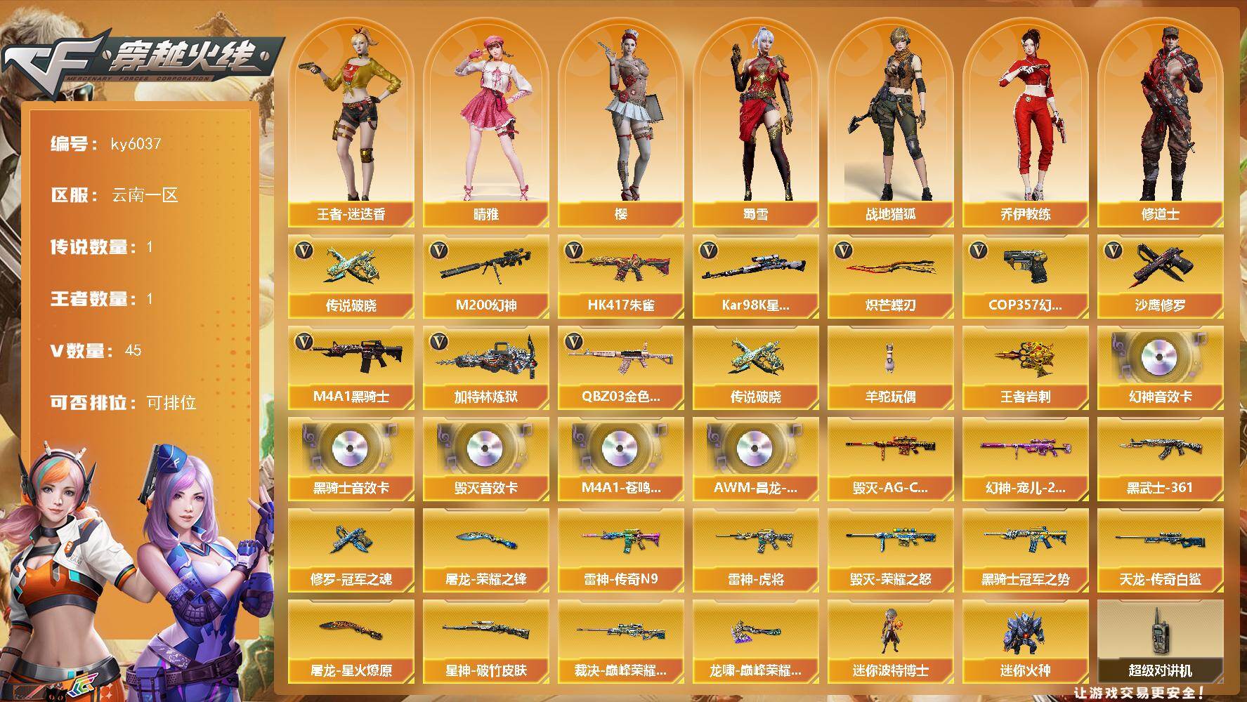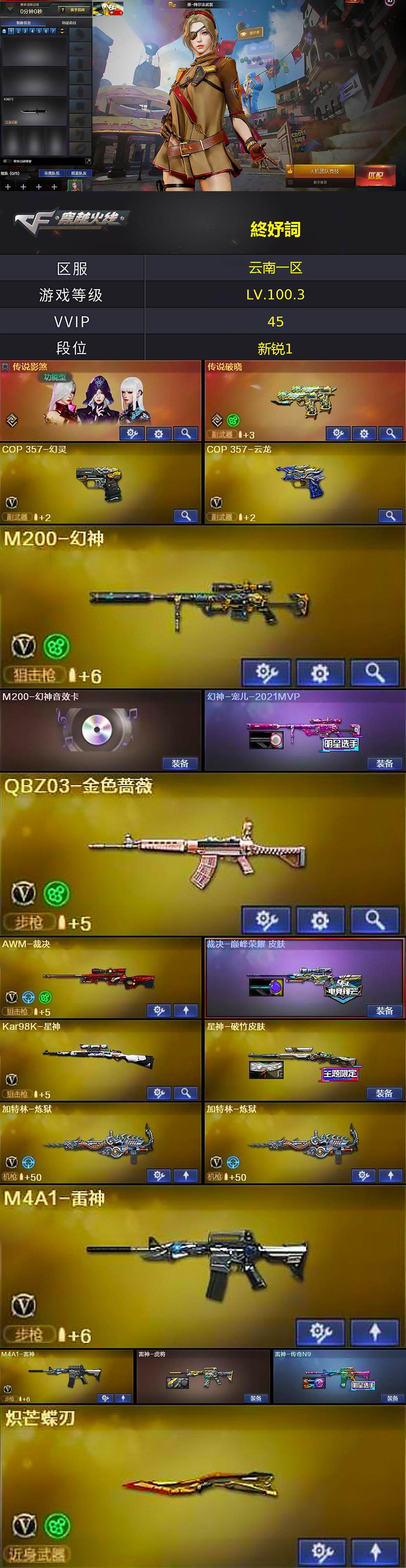 [17234955]云南一区-44V-1王者武器数-0炫金武器数 【传说武器】:传说破晓 【传说角色】:传说影煞 【热门武器】:传说破晓,QBZ03-金色蔷薇,HK417-朱雀,M200-幻神,Kar98K-星神,M4A1-黑骑士,加特林-炼狱*2,羊驼玩偶,COP 357-幻灵,沙鹰-修罗*2,炽芒蝶刃 【王者炫金武器】:王者岩刺 【音效卡】:M200-幻神音效卡,M4A1-黑骑士音效卡,Barrett-毁灭音效卡,M4A1-苍鸣雷神音效卡,AWM-昌龙-怀旧音效卡 【皮肤】:幻神-宠儿-2021MVP,裁决-巅峰荣耀 皮肤,星神-破竹皮肤,雷神-虎将,雷神-传奇N9,毁灭-荣耀之怒,毁灭-AG-CFPLS15冠军,黑骑士-冠军之势,AK47-黑武士-361,AWM-天龙-传奇白鲨,修罗-冠军之魂,屠龙-荣耀之锋,屠龙-星火燎原,龙啸-巅峰荣耀 皮肤 【角色】:樱,晴雅,战地猎狐,王者-迷迭香,奇洋探员,乔伊教练,修道士,云海玲珑,葵-阿尔法武装,飞虎队-X,嘉年华灵狐,娟娟,灵狐者-X,蜀雪,兔囡囡 【人偶武器】:迷你波特博士,迷你火种 【暴走生化】:超级对讲机 【英雄级武器】:M4A1-雷神*2,M4A1-黑骑士,AK47-无影,AK12-天启,HK417-朱雀,超新星-热带奇洋,QBZ03-金色蔷薇,机械迷城-穹宇,Barrett-毁灭*2,AWM-裁决,M200-幻神,Kar98K-星神,加特林-炼狱*2,沙鹰-修罗*2,沙鹰-天神*2,COP 357-幻灵,COP 357-云龙,屠龙*2,擎天,麒麟刺,幻灵之锋,炽芒蝶刃,龙啸-热带奇洋,高爆手雷-幻灵*4,高爆手雷-云龙,闪光弹-幻灵*3,烟雾弹-幻灵*3 【道具】:BS战队炫彩背包,CFS限定背包,Q9战队炫彩背包,WE炫彩背包,云山科技背包,奇洋探员-海龟背包,战舰背包,热带奇洋炫彩背包,超级背包,黄金超能特工背包,黑桃战神背包,女皇终结者-魔龙之吻,救世主-黑桃战神,绿色巨人,灵魂忍者,迷雾幽灵,生化弹匣,夺命之镰,防化服*3,金色流光-枪王排位*2,星辰流光-枪王排位,巅峰赛先锋-金色流光,流光-再燃火线,枪王排位28赛季金色流光,枪王排位29赛季金色流光,热带奇洋表情,CFPL选手表情-第1套,C4-黑曜,C4-再燃火线,防弹头盔*4,防弹衣*4,C4工具钳*4,手雷包*4 【特殊枪械】:1黑骑士,2炼狱
