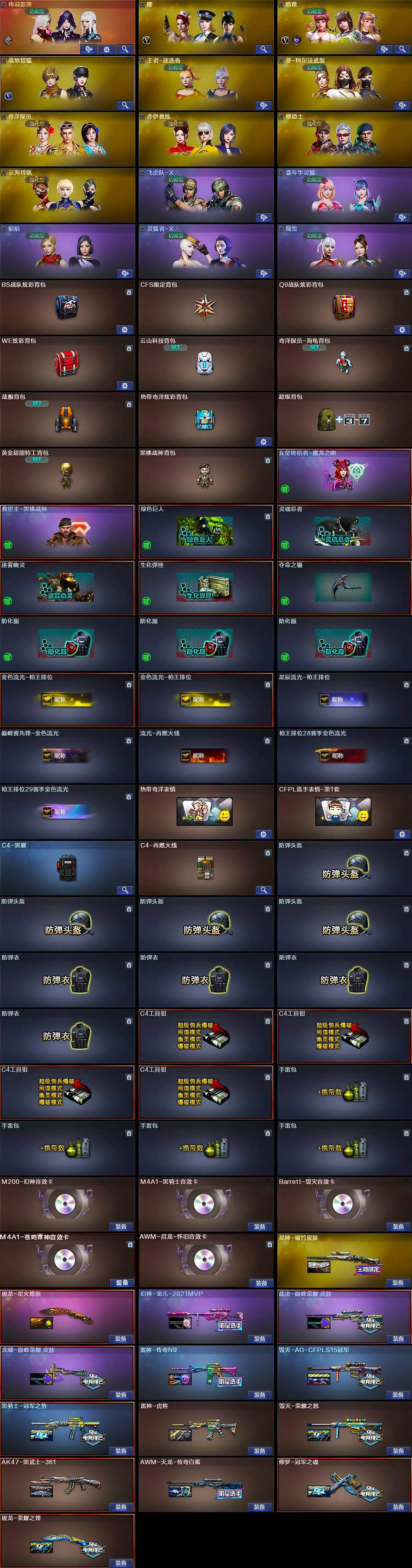 【道具】:BS战队炫彩背包,CFS限定背包,Q9战队炫彩背包,WE炫彩背包,云山科技背包,奇洋探员-海龟背包,战舰背包,热带奇洋炫彩背包,超级背包,黄金超能特工背包,黑桃战神背包,女皇终结者-魔龙之吻,救世主-黑桃战神,绿色巨人,灵魂忍者,迷雾幽灵,生化弹匣,夺命之镰,防化服*3,金色流光-枪王排位*2,星辰流光-枪王排位,巅峰赛先锋-金色流光,流光-再燃火线,枪王排位28赛季金色流光,枪王排位29赛季金色流光,热带奇洋表情,CFPL选手表情-第1套,C4-黑曜,C4-再燃火线,防弹头盔*4,防弹衣*4,C4工具钳*4,手雷包*4