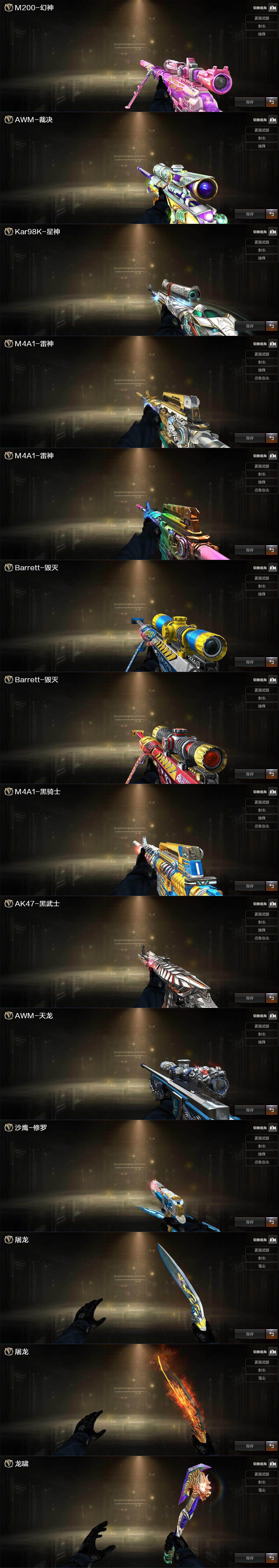 【音效卡】:M200-幻神音效卡,M4A1-黑骑士音效卡,Barrett-毁灭音效卡,M4A1-苍鸣雷神音效卡,AWM-昌龙-怀旧音效卡