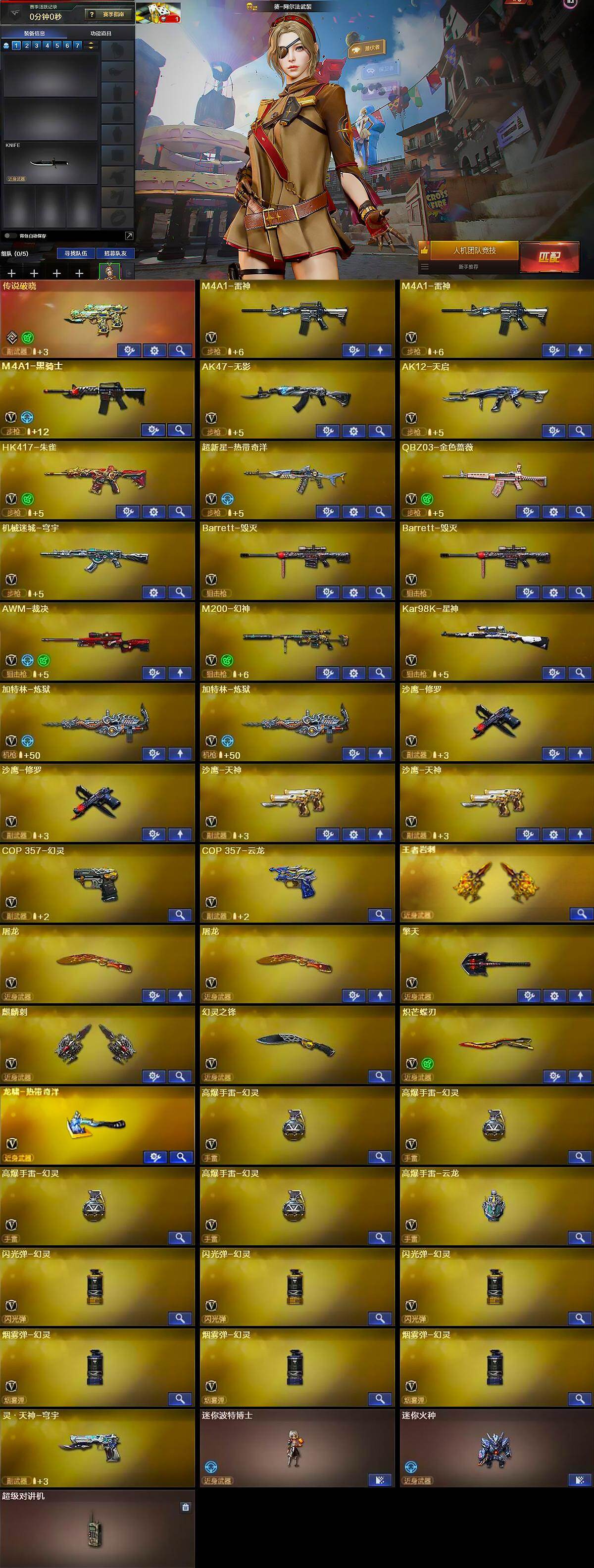 【英雄级武器】:M4A1-雷神*2,M4A1-黑骑士,AK47-无影,AK12-天启,HK417-朱雀,超新星-热带奇洋,QBZ03-金色蔷薇,机械迷城-穹宇,Barrett-毁灭*2,AWM-裁决,M200-幻神,Kar98K-星神,加特林-炼狱*2,沙鹰-修罗*2,沙鹰-天神*2,COP 357-幻灵,COP 357-云龙,屠龙*2,擎天,麒麟刺,幻灵之锋,炽芒蝶刃,龙啸-热带奇洋,高爆手雷-幻灵*4,高爆手雷-云龙,闪光弹-幻灵*3,烟雾弹-幻灵*3