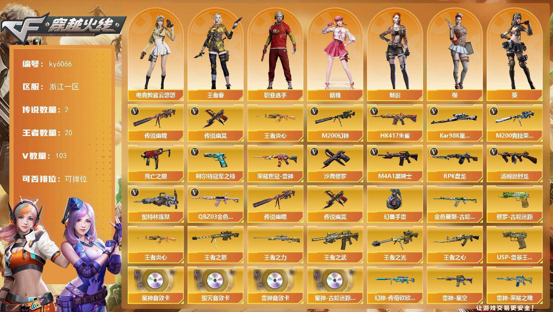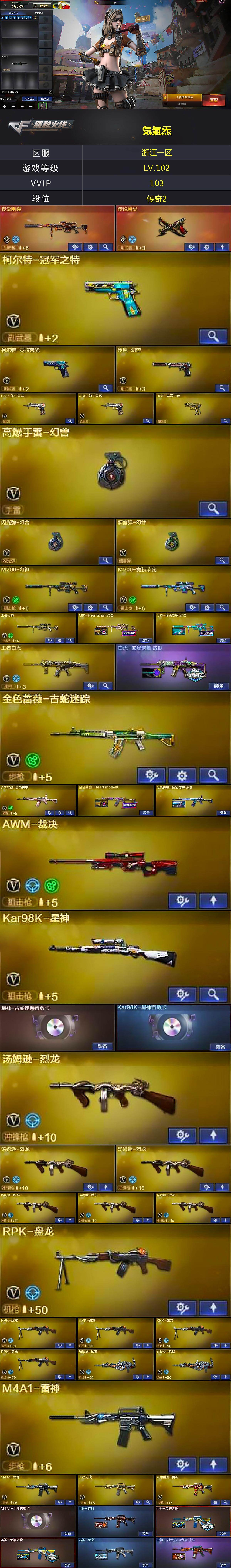 [17234993]浙江一区-107V-20王者武器数-0炫金武器数 【传说武器】:传说幽瞳,传说幽冥 【热门武器】:传说幽瞳,传说幽冥,QBZ03-金色蔷薇,HK417-朱雀,M200-幻神,金色蔷薇-古蛇迷踪,修罗-古蛇迷踪,M200-竞技荣光,死亡之眼,荣耀世冠-雷神,柯尔特-冠军之特,王者炎心,Kar98K-星神,M4A1-黑骑士*2,汤姆逊-烈龙*6,RPK-盘龙*5,加特林-炼狱*2,沙鹰-修罗*6,高爆手雷-幻兽 【王者炫金武器】:王者炎心,王者之武,王者之心,王者之光,王者之怒,王者之力,USP-雷暴王者 【音效卡】:星神-古蛇迷踪音效卡,M4A1-雷神音效卡,Barrett-毁灭音效卡,Kar98K-星神音效卡 【皮肤】:幻神-Heartshot 皮肤,幻神-传奇欧欧 皮肤,白虎-巅峰荣耀 皮肤,金色蔷薇-Heartshot皮肤,金色蔷薇-破浪逐光 皮肤,雷神-暗月,雷神-荣耀之魄*2,雷神-星空,雷神-源计划2.0专属 皮肤,火麒麟-冠军之心,AK47-火麒麟-传奇EVEN,火麒麟-平天大圣,毁灭-暗月*2,毁灭-荣耀之怒,毁灭-冠军之怒,毁灭-百城浙江 皮肤,黑龙-暗月,黑龙-墨子皮肤,黑骑士-战神马超,黑骑士-破界 皮肤,无影-暗月*2,天启-暗月*3,天龙-秘银,极光-能量核心,修罗-能量核心*5,修罗-星空,屠龙-荣耀之锋,屠龙-破浪逐光 皮肤,屠龙-巅峰荣耀 皮肤 【角色】:葵,樱,魅影,电竞教官-云悠悠,晴雅,王者春,蛇隐宗,暗夜-X,北极狐-X,电竞少女,芳心审判者,飞虎队-X,风暴女,虎妞,嘉年华灵狐,娟娟,兰-新年限定,猎狐者-追月,0号玩家,灵狐者-X,龙儿,麻雀,曼陀罗-X,萌儿,潘多拉-X,青霞仙子,蛇姬,铁骑荣耀,兔囡囡,维纳斯,雪莉杨-摸金校尉,夜玫瑰-宠粉,影武者-X,游珑儿,职业选手 【人偶武器】:巴雷特-零-水下丽影,COP-旗袍,M4A1-刀锋 【暴走生化】:死亡之眼 【挑战大师】:激光毁灭者III 【英雄级武器】:M4A1-千变*2,AK47-火麒麟*4,M4A1-黑龙,M4A1-雷神*2,M4A1-黑骑士*2,AK47-无影,M4A1-死神,AK12-天启,M4A1-武圣,M4A1-龙血,HK417-朱雀,金色蔷薇-古蛇迷踪,M4A1-玫瑰精灵,QBZ03-金色蔷薇,M4A1-猎神,9A91-烈火,王者之魄-觉醒版,AK-4