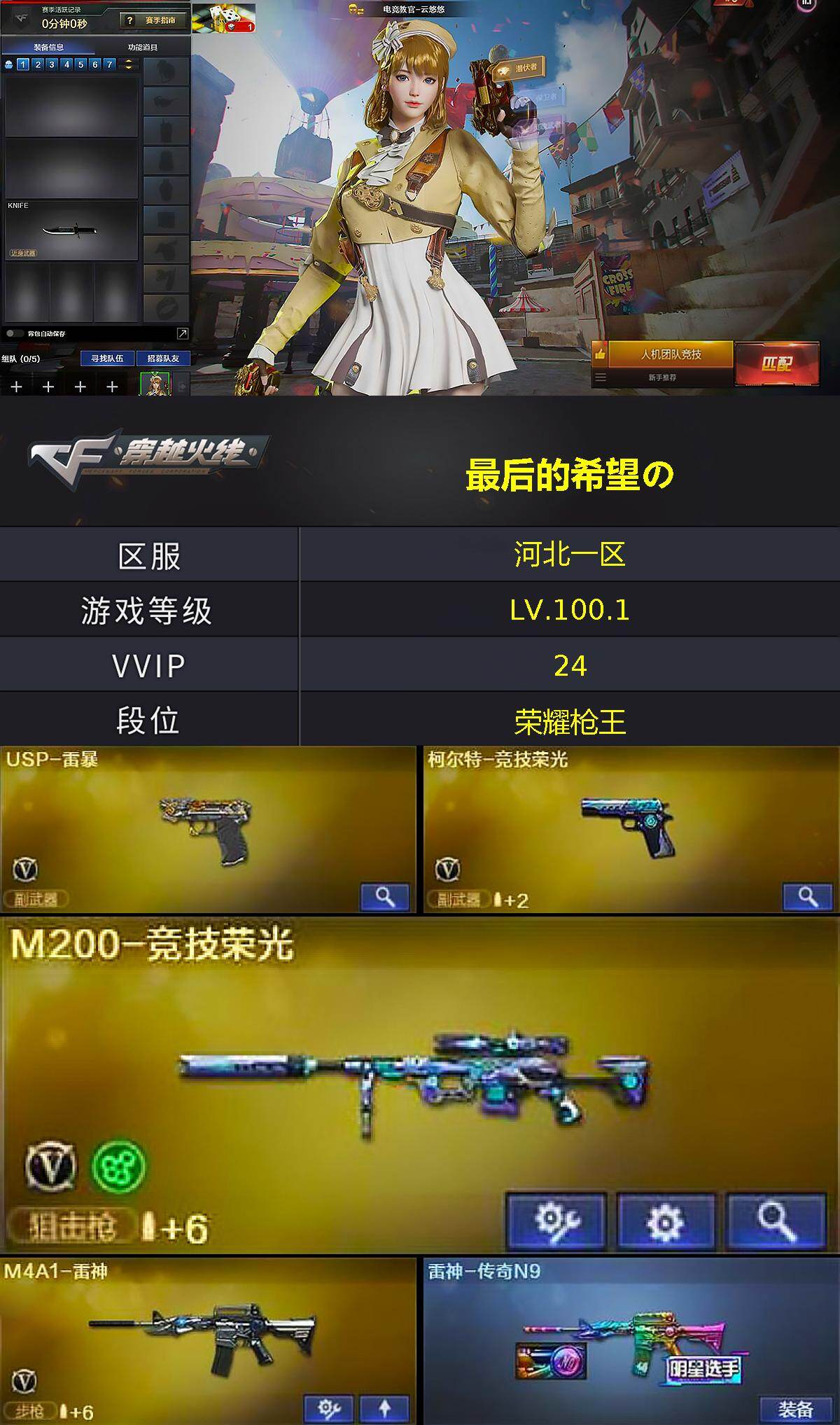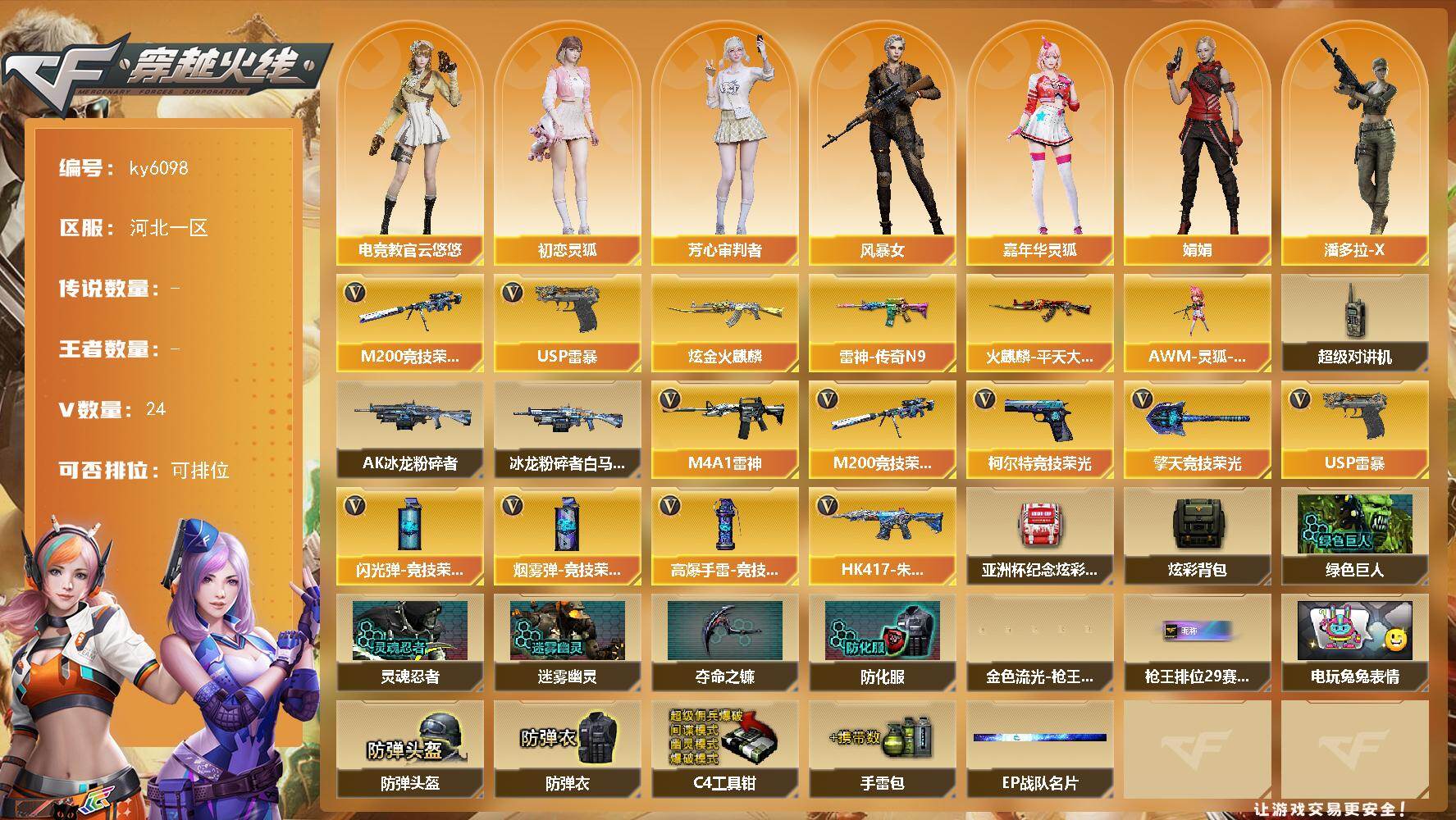 [17235389]河北一区-26V-0王者武器数-1炫金武器数 【热门武器】:M200-竞技荣光,USP-雷暴 【王者炫金武器】:炫金火麒麟 【皮肤】:雷神-传奇N9,火麒麟-平天大圣 【角色】:电竞教官-云悠悠,初恋灵狐,芳心审判者,风暴女*2,嘉年华灵狐,娟娟,潘多拉-X,兔囡囡 【人偶武器】:AWM-灵狐-15周年嘉年华 【暴走生化】:超级对讲机 【挑战大师】:AK47-冰龙粉碎者,冰龙粉碎者-白马银枪 【英雄级武器】:M4A1-雷神,HK417-朱雀-电竞之星,M200-竞技荣光,USP-雷暴,柯尔特-竞技荣光,擎天-竞技荣光,高爆手雷-竞技荣光*6,闪光弹-竞技荣光*5,烟雾弹-竞技荣光*3 【道具】:亚洲杯纪念炫彩背包,炫彩背包,绿色巨人,灵魂忍者,迷雾幽灵,夺命之镰,防化服*2,金色流光-枪王排位*2,星辰流光-枪王排位,枪王排位29赛季金色流光,电玩兔兔表情,EP战队名片,防弹头盔*4,防弹衣*4,C4工具钳*4,手雷包*4 【特殊枪械】: