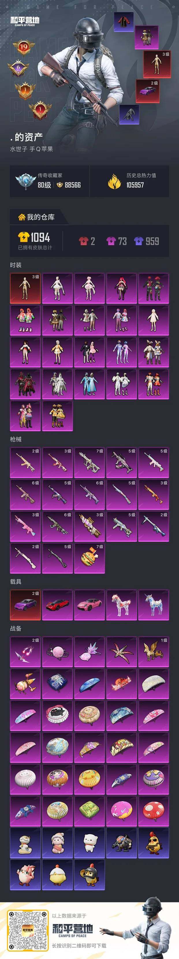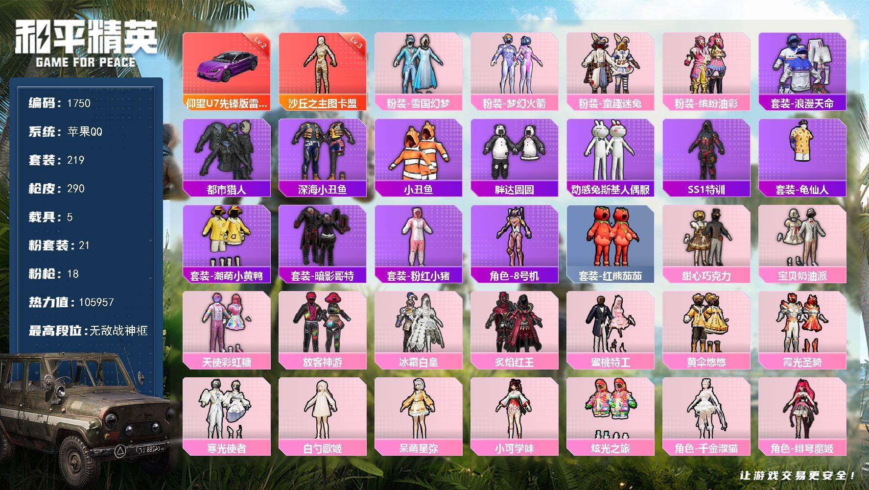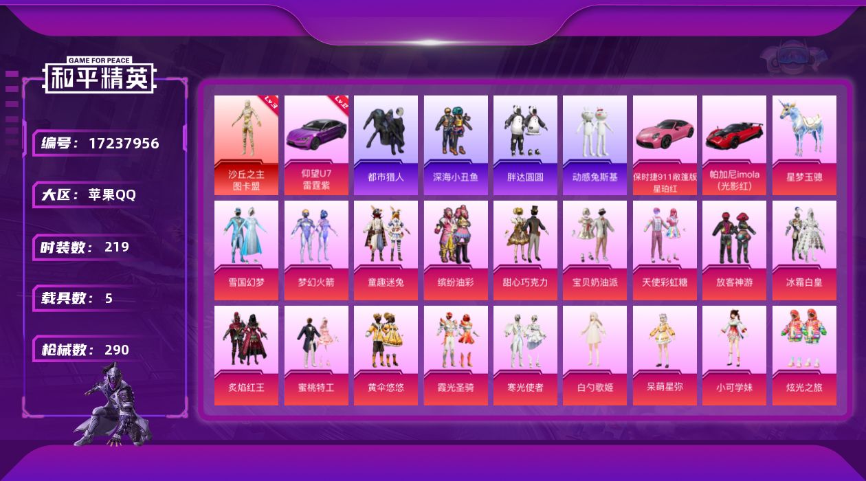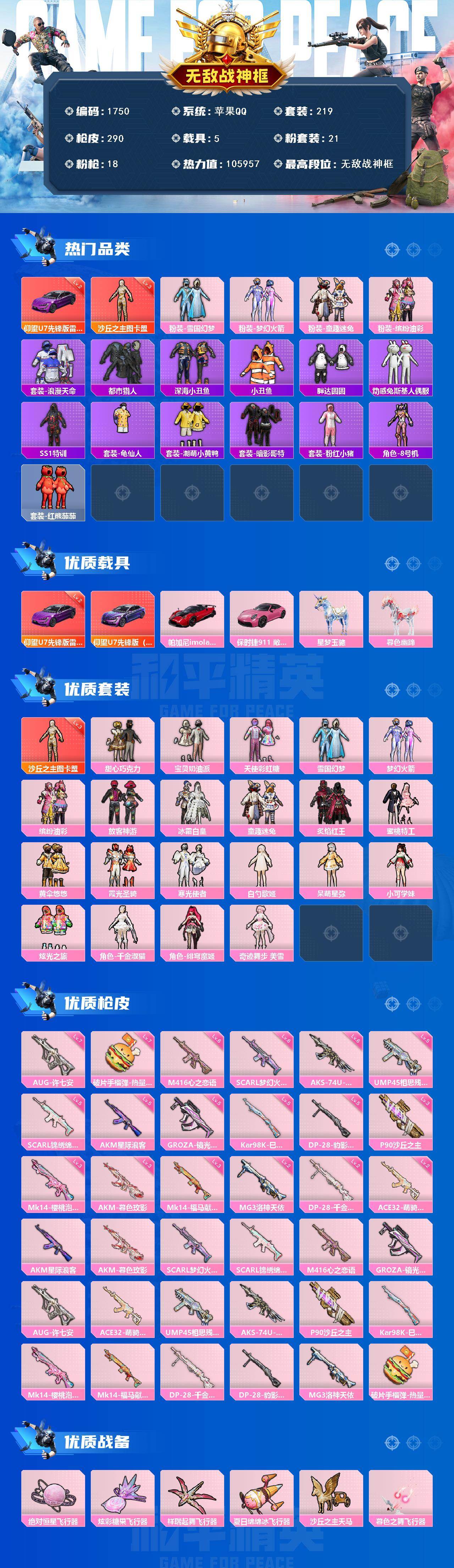 [17237956]【1750】苹果 手Q-无敌战神框-1神装-21粉装-18特效枪-5载具-6粉色飞行器-105957热力值-19王牌印记-219套装-290枪皮