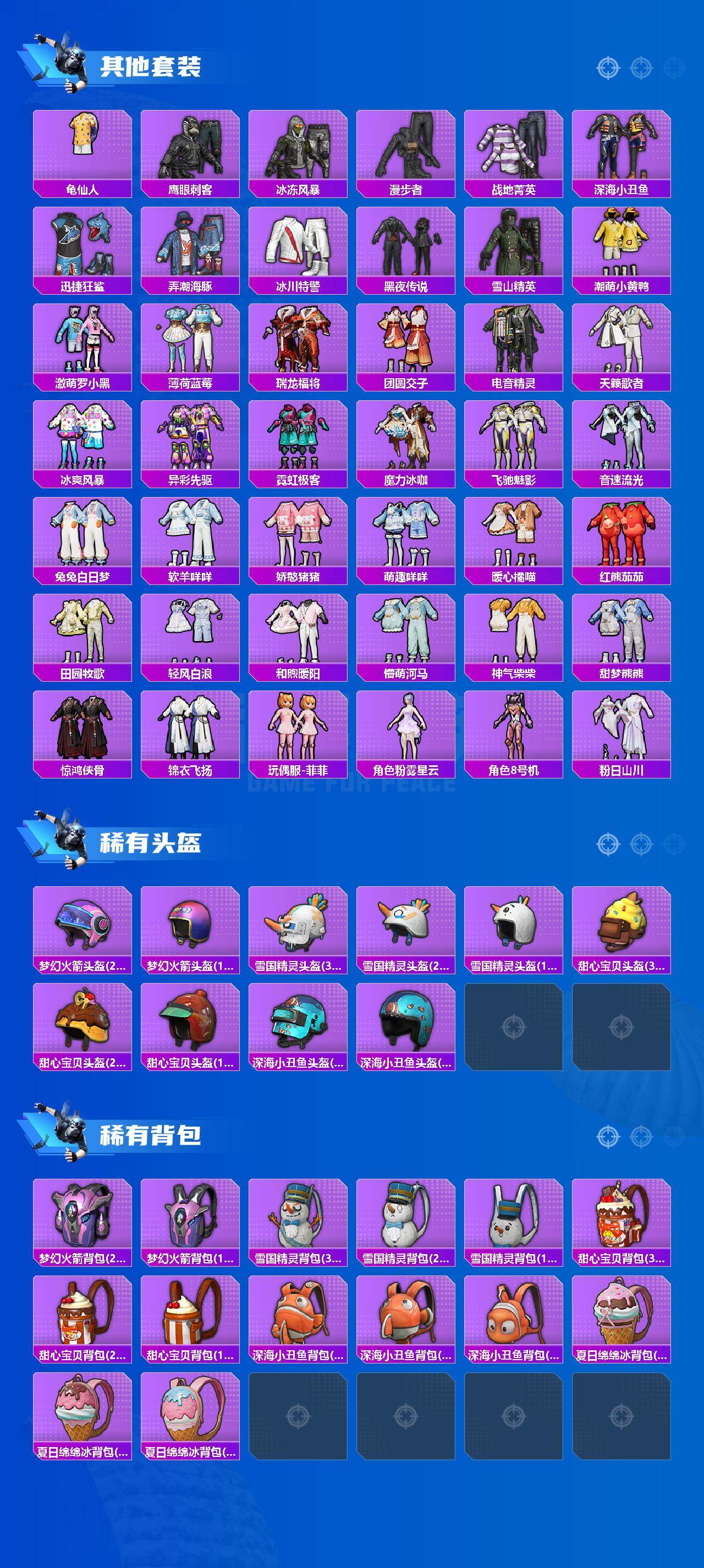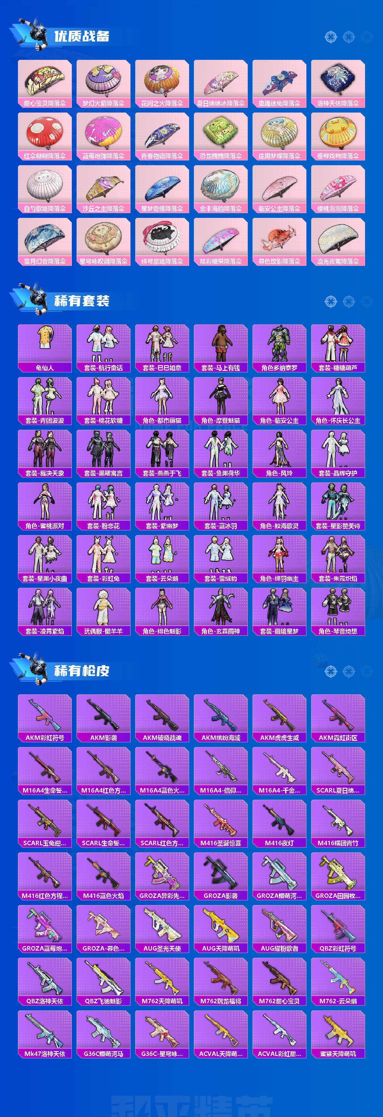 AKM-星际浪客,SCAR-L-梦幻火箭,SCAR-L-锦绣绵绵,M416-心之恋语,GROZA-镜光银凌,AUG-许七安,UMP45-相思残雪,AKS-74U-信仰神谕,P90-沙丘之主,Kar98K-巳巳如意,Mk14-樱桃泡泡,DP-28-千金淑猫,MG3-洛神天依,破片手榴弹-热量炸弹