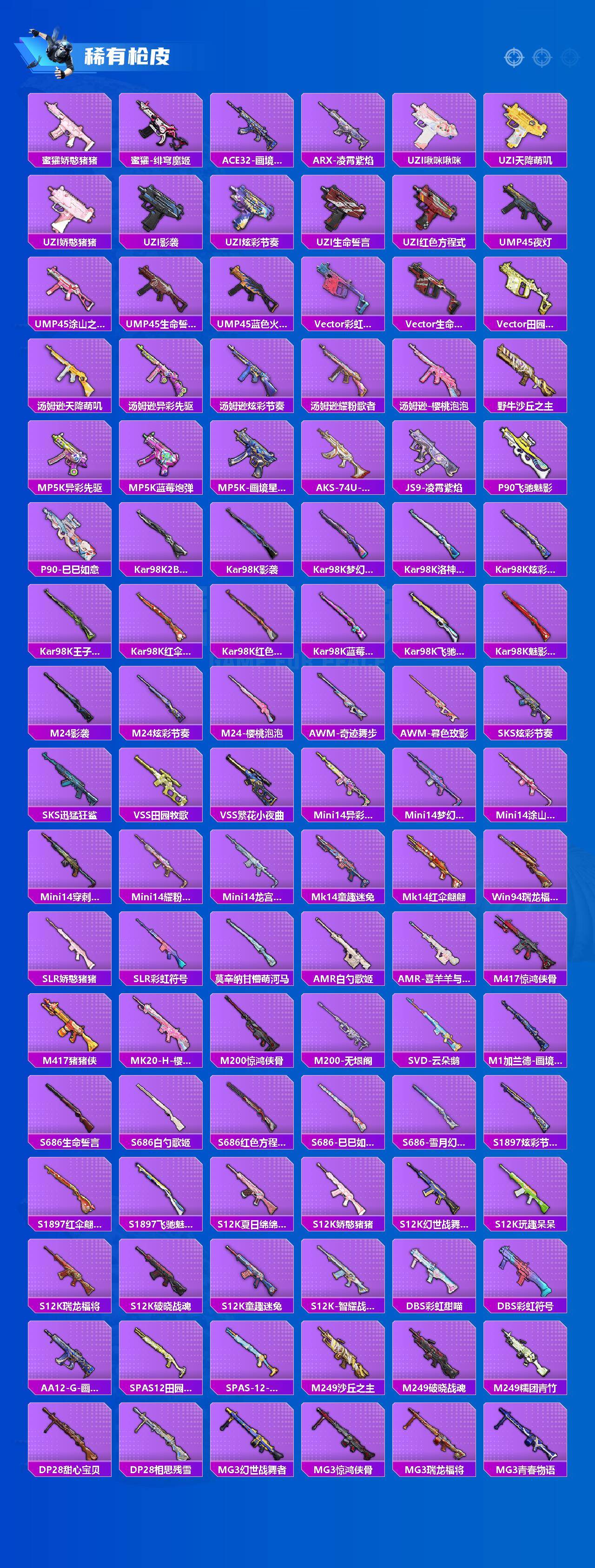 【粉色枪皮】:AKM-星际浪客,AKM-暮色玫影,SCAR-L-梦幻火箭,SCAR-L-锦绣绵绵,M416-心之恋语,GROZA-镜光银凌,AUG-许七安,ACE32-萌骑漫游,UMP45-相思残雪,AKS-74U-信仰神谕,P90-沙丘之主,Kar98K-巳巳如意,Mk14-樱桃泡泡,Mk14-福马献瑞,DP-28-千金淑猫,DP-28-豹影疾电,MG3-洛神天依,破片手榴弹-热量炸弹
