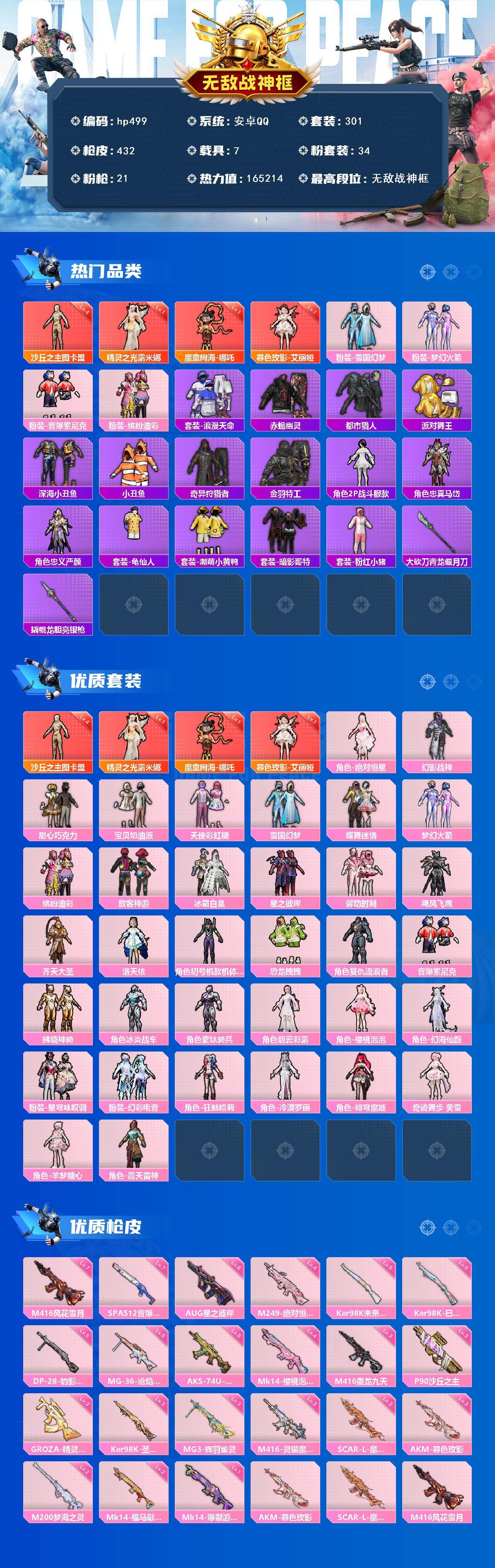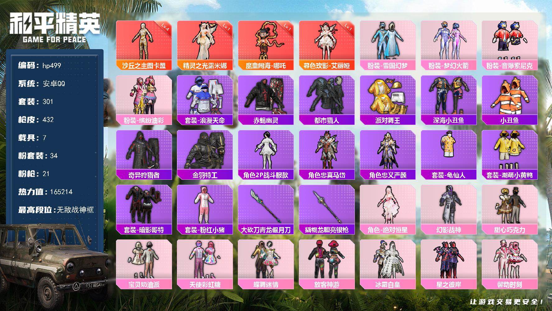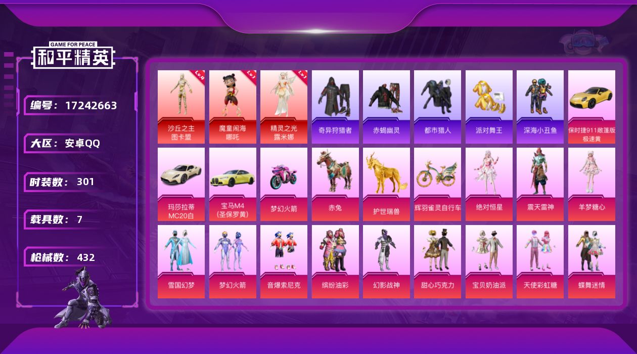 [17242663]安卓 手Q-无敌战神框-4神装-34粉装-21特效枪-7载具-26粉色飞行器-165214热力值-14王牌印记-301套装-432枪皮