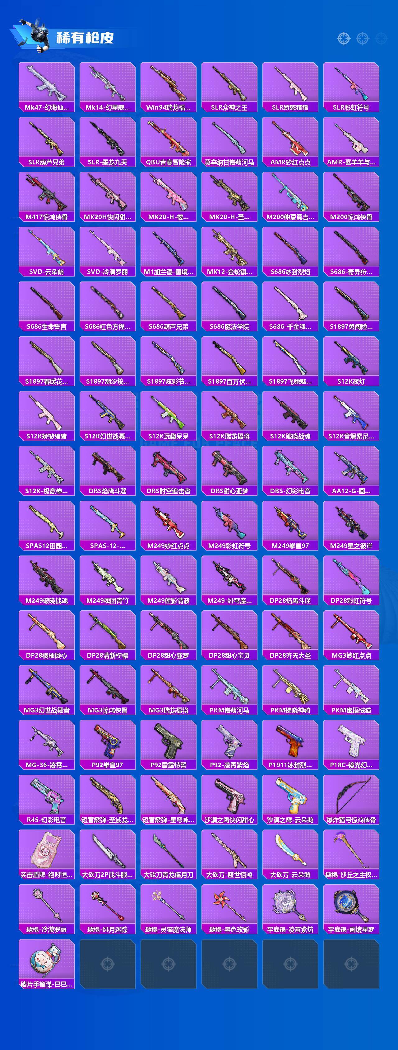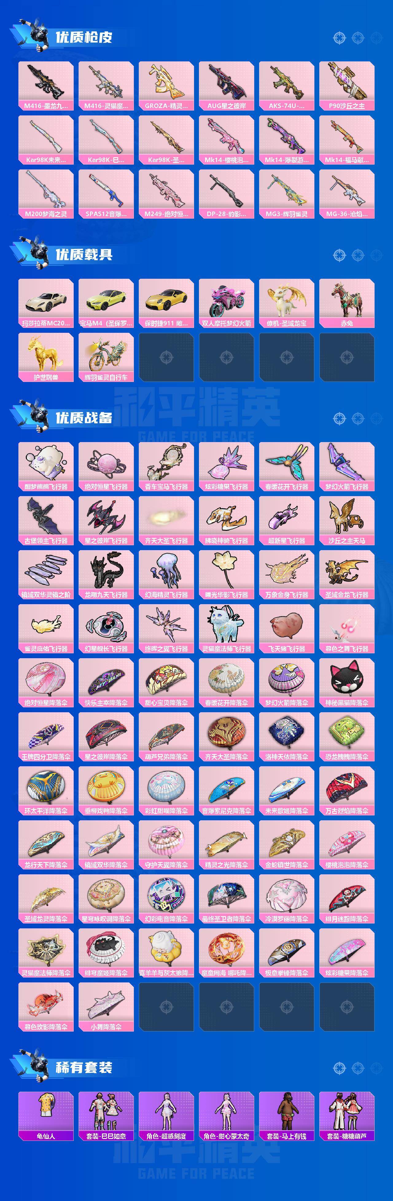 M416-风花雪月,M416-墨龙九天,GROZA-精灵之光,AUG-星之彼岸,P90-沙丘之主,Kar98K-未来歌姬,Kar98K-巳巳如意,Kar98K-圣域龙灵,Mk14-樱桃泡泡,M200-梦海之灵,SPAS-12-音爆索尼克
