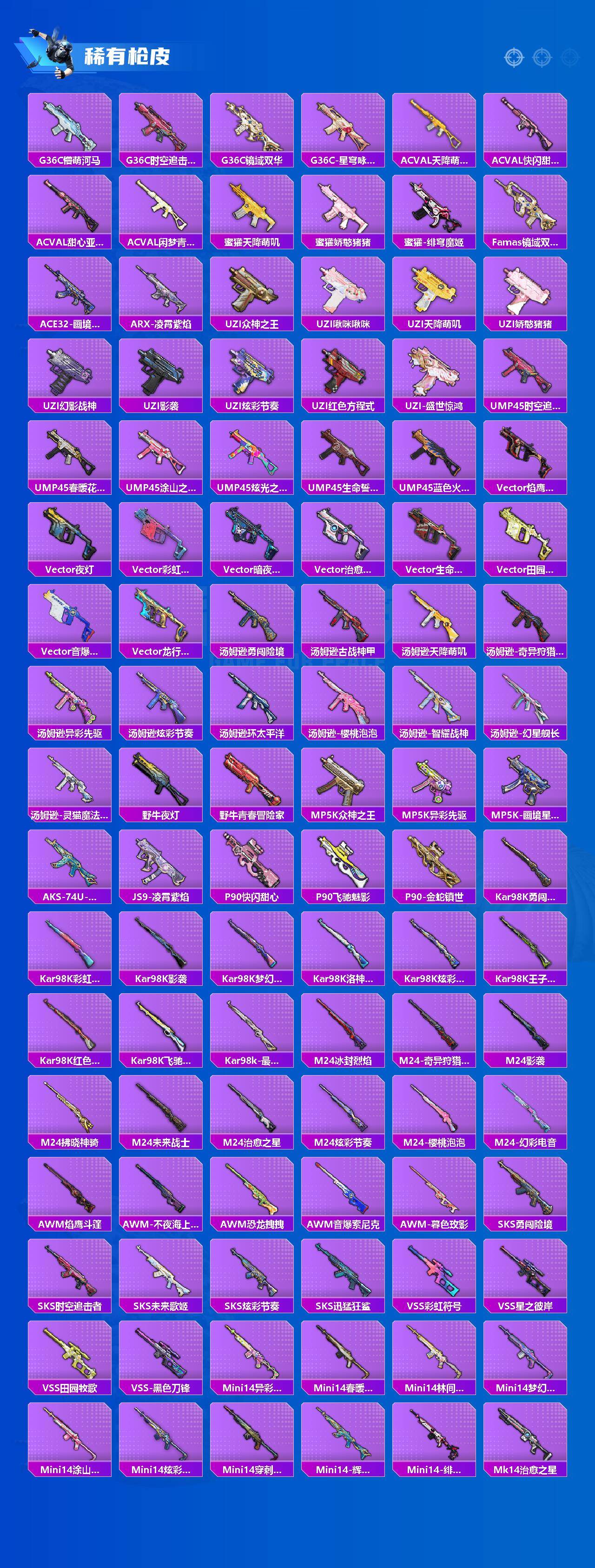 AKM-奇异狩猎者,AKM-缤纷海域,M416-魔法学院,AUG-魔法学院,M762-奇异狩猎者,M762-瑞龙福将,M24-奇异狩猎者,Mini14-林间仙鹿,S686-奇异狩猎者