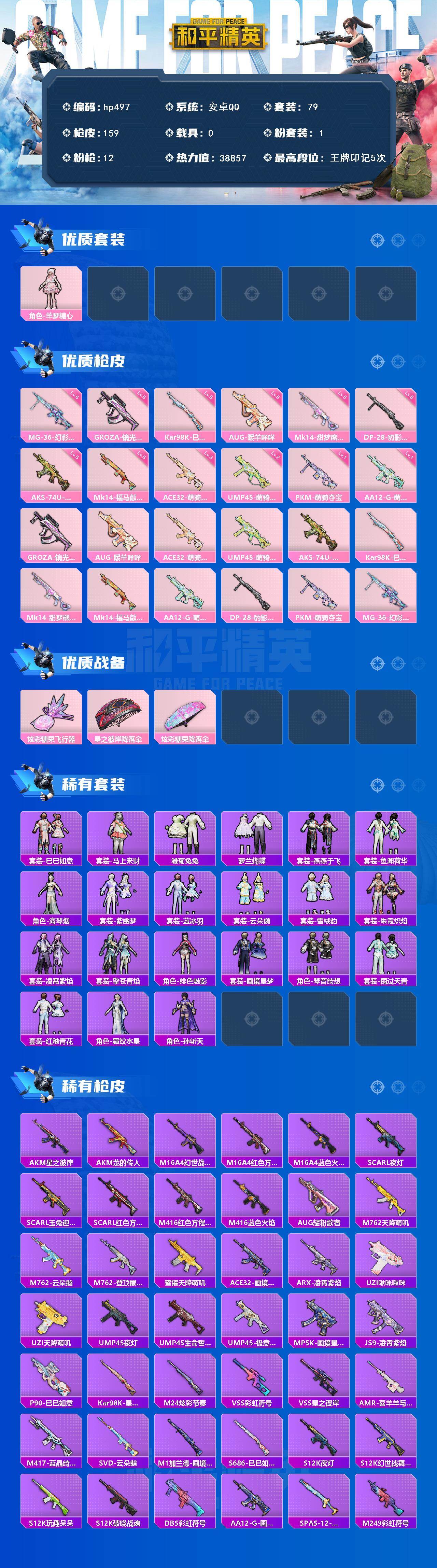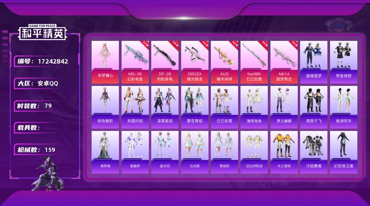 [17242842]安卓 手Q-1粉装-12特效枪-0载具-1粉色飞行器-38857热力值-5王牌印记-79套装-159枪皮 【粉色套装】:角色-羊梦糖心 【粉色枪皮等级】:GROZA-镜光银凌(五级),AUG-暖羊咩咩(五级),ACE32-萌骑漫游(三级),UMP45-萌骑冒险(二级),AKS-74U-森灵之息(五级),Kar98K-巳巳如意(五级),Mk14-甜梦熊击(五级),Mk14-福马献瑞(五级),AA12-G-萌骑幻想(一级),DP-28-豹影疾电(五级),PKM-萌骑夺宝(一级),MG-36-幻彩电音(六级) 【粉色枪皮】:GROZA-镜光银凌,AUG-暖羊咩咩,ACE32-萌骑漫游,UMP45-萌骑冒险,AKS-74U-森灵之息,Kar98K-巳巳如意,Mk14-甜梦熊击,Mk14-福马献瑞,AA12-G-萌骑幻想,DP-28-豹影疾电,PKM-萌骑夺宝,MG-36-幻彩电音 【粉色飞行器】:炫彩糖果飞行器 【粉色降落伞】:星之彼岸降落伞,炫彩糖果降落伞 【稀有套装】:套装-巳巳如意,套装-雪国风尚,套装-炫彩糖果,套装-马上来财,套装-雏菊兔兔,套装-萝兰蝴蝶,套装-燕燕于飞,套装-鱼渊荷华,角色-海琴烟,套装-紫幽梦,套装-蓝冰羽,套装-云朵鹅,套装-雪绒豹,套装-朱霞炽焰,套装-凌霄紫焰,套装-擎苍青焰,角色-绯色魅影,套装-画境星梦,套装-琴音绮想,套装-雨过天青,套装-红釉青花,角色-霜纹水星,角色-孙斩天 【稀有枪皮】:AKM-星之彼岸,AKM-龙的传人,M16A4-幻世战舞者,M16A4-红色方程式,M16A4-蓝色火焰,SCAR-L-夜灯,SCAR-L-玉兔迎春,SCAR-L-红色方程式,M416-红色方程式,M416-蓝色火焰,AUG-耀粉歌者,M762-天降萌叽,M762-云朵鹅,M762-登顶巅峰,蜜獾-天降萌叽,ACE32-画境星梦,ARX-凌霄紫焰,UZI-啾咪啾咪,UZI-天降萌叽,UMP45-夜灯,UMP45-生命誓言,UMP45-极意拳锋,MP5K-画境星梦,JS9-凌霄紫焰,P90-巳巳如意,Kar98K-星穹咏叹调,M24-炫彩节奏,VSS-彩虹符号,VSS-星之彼岸,AMR-喜羊羊与灰太狼,M417-蓝晶绮麟,SVD-云朵鹅,M1加兰德-画境星梦,S686-巳巳如意,S12K-玩趣呆呆,S12K-破晓战魂,S12K-夜灯,S12K