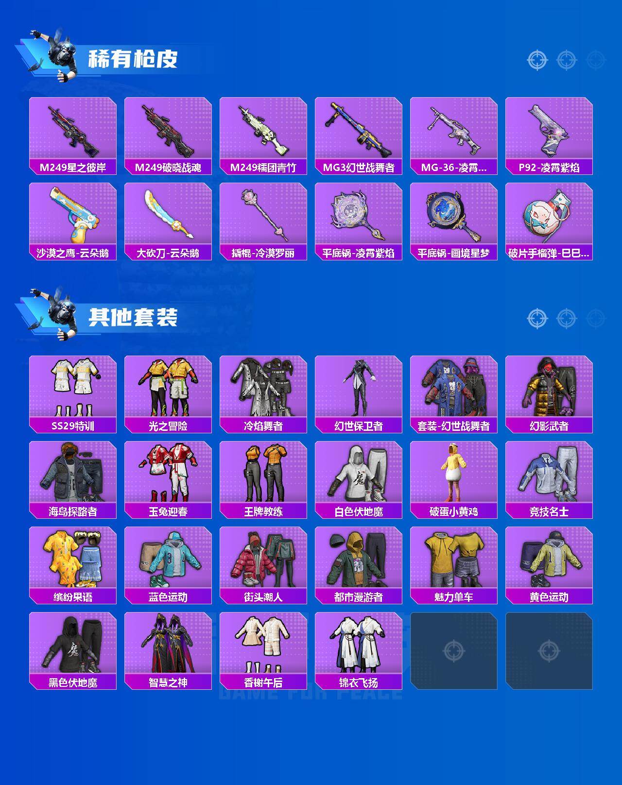 【稀有枪皮】:AKM-星之彼岸,AKM-龙的传人,M16A4-幻世战舞者,M16A4-红色方程式,M16A4-蓝色火焰,SCAR-L-夜灯,SCAR-L-玉兔迎春,SCAR-L-红色方程式,M416-红色方程式,M416-蓝色火焰,AUG-耀粉歌者,M762-天降萌叽,M762-云朵鹅,M762-登顶巅峰,蜜獾-天降萌叽,ACE32-画境星梦,ARX-凌霄紫焰,UZI-啾咪啾咪,UZI-天降萌叽,UMP45-夜灯,UMP45-生命誓言,UMP45-极意拳锋,MP5K-画境星梦,JS9-凌霄紫焰,P90-巳巳如意,Kar98K-星穹咏叹调,M24-炫彩节奏,VSS-彩虹符号,VSS-星之彼岸,AMR-喜羊羊与灰太狼,M417-蓝晶绮麟,SVD-云朵鹅,M1加兰德-画境星梦,S686-巳巳如意,S12K-玩趣呆呆,S12K-破晓战魂,S12K-夜灯,S12K