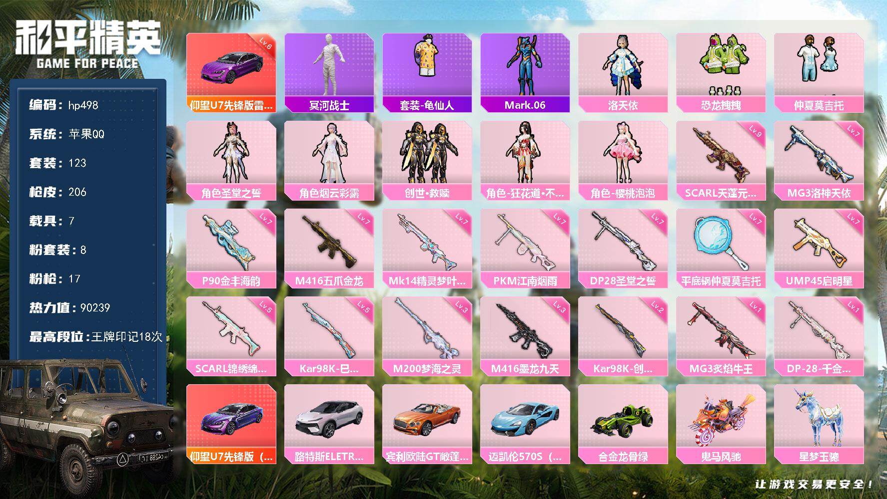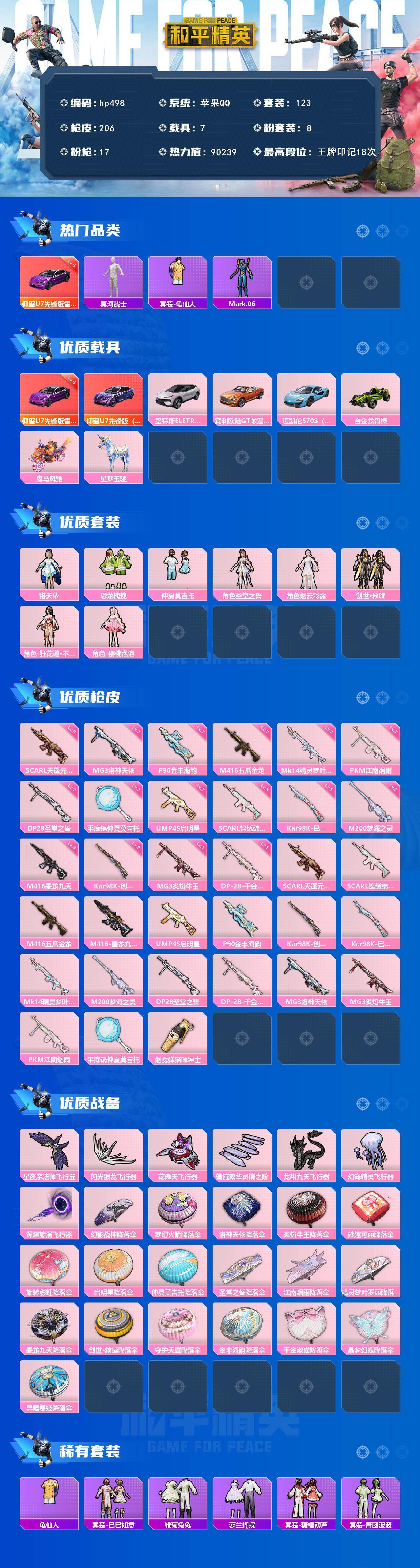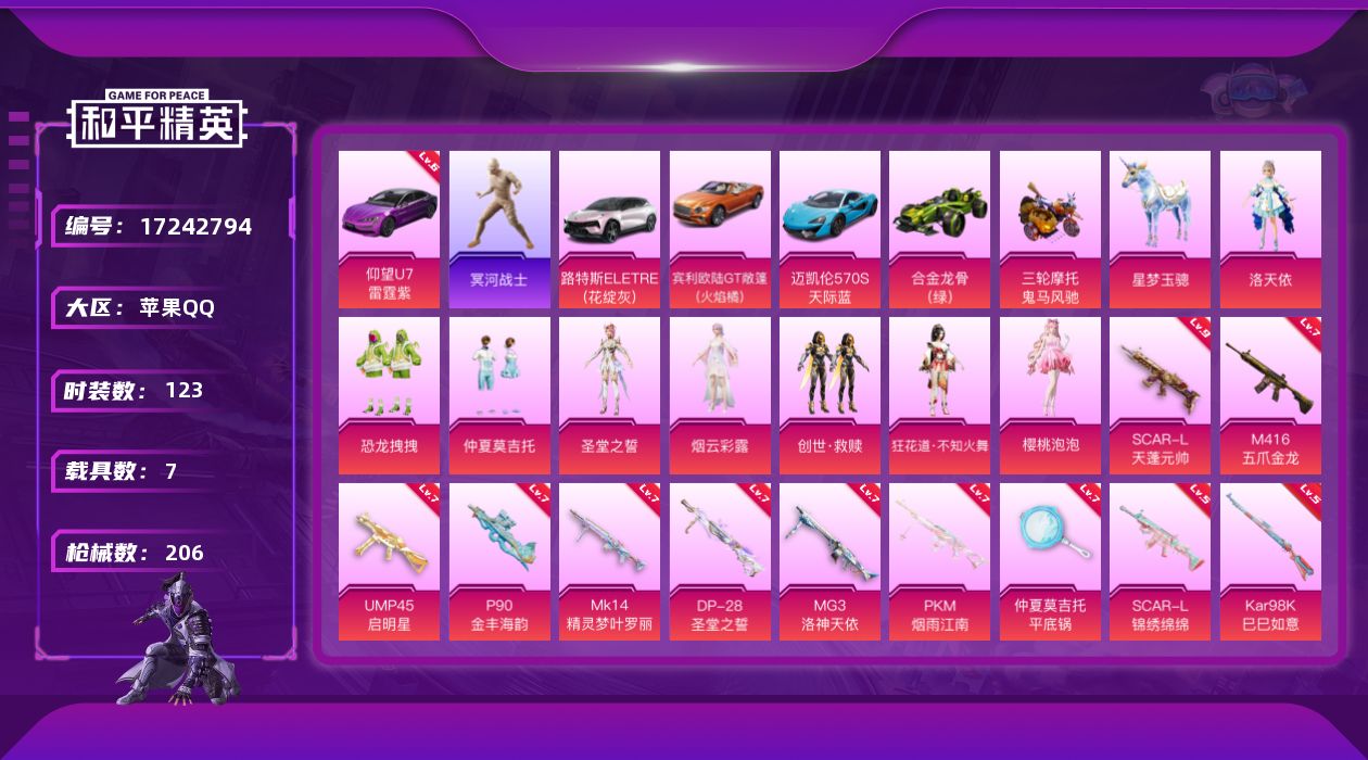 [17242794]苹果 手Q-8粉装-17特效枪-7载具-7粉色飞行器-90239热力值-18王牌印记-123套装-206枪皮 【红色载具】:仰望U7(雷霆紫)(六级) 【热门品类】:套装-冥河战士,套装-龟仙人,角色-Mark.06 【粉色套装】:角色-洛天依,粉装-恐龙拽拽,粉装-仲夏莫吉托,角色-圣堂之誓,角色-烟云彩露,套装-创世·救赎,角色-狂花道·不知火舞,角色-樱桃泡泡 【粉色枪皮等级】:SCAR-L-天蓬元帅(九级),SCAR-L-锦绣绵绵(五级),M416-五爪金龙(七级),M416-墨龙九天(三级),UMP45-启明星(七级),P90-金丰海韵(七级),Kar98K-创世·救赎(二级),Kar98K-巳巳如意(五级),Mk14-精灵梦叶罗丽(七级),M200-梦海之灵(三级),DP-28-圣堂之誓(七级),DP-28-千金淑猫(一级),MG3-洛神天依(七级),MG3-炙焰牛王(一级),PKM-江南烟雨(七级),平底锅-仲夏莫吉托(七级) 【粉色载具】:仰望U7(雷霆紫),路特斯ELETRE(花绽灰),宾利欧陆GT敞篷(火焰橘),迈凯伦570S(天际蓝),合金龙骨(绿),鬼马风驰,星梦玉骢 【粉色枪皮】:SCAR-L-天蓬元帅,SCAR-L-锦绣绵绵,M416-五爪金龙,M416-墨龙九天,UMP45-启明星,P90-金丰海韵,Kar98K-创世·救赎,Kar98K-巳巳如意,Mk14-精灵梦叶罗丽,M200-梦海之灵,DP-28-圣堂之誓,DP-28-千金淑猫,MG3-洛神天依,MG3-炙焰牛王,PKM-江南烟雨,平底锅-仲夏莫吉托,烟雾弹-猫咪绅士 【粉色飞行器】:星夜魔法师飞行翼,闪光银龙飞行器,花傲天飞行器,镜域双华-灵镜之阶,龙翔九天飞行器,幻海精灵飞行器,深渊漩涡飞行器 【粉色降落伞】:幻影战神降落伞,梦幻火箭降落伞,洛神天依降落伞,炙焰牛王降落伞,妙趣可丽降落伞,旋转彩虹降落伞,启明星降落伞,仲夏莫吉托降落伞,圣堂之誓降落伞,江南烟雨降落伞,精灵梦叶罗丽降落伞,墨龙九天降落伞,创世·救赎降落伞,守护天翼降落伞,金丰海韵降落伞,千金淑猫降落伞,晶梦幻蝶降落伞,异瞳寒姬降落伞 【稀有套装】:套装-龟仙人,套装-巳巳如意,套装-雪国风尚,套装-雏菊兔兔,套装-萝兰蝴蝶,套装-糖糖葫芦,套装-青团波波,套装-棉花软糖,套装-燕燕于飞,套装-鱼渊荷华,套装-