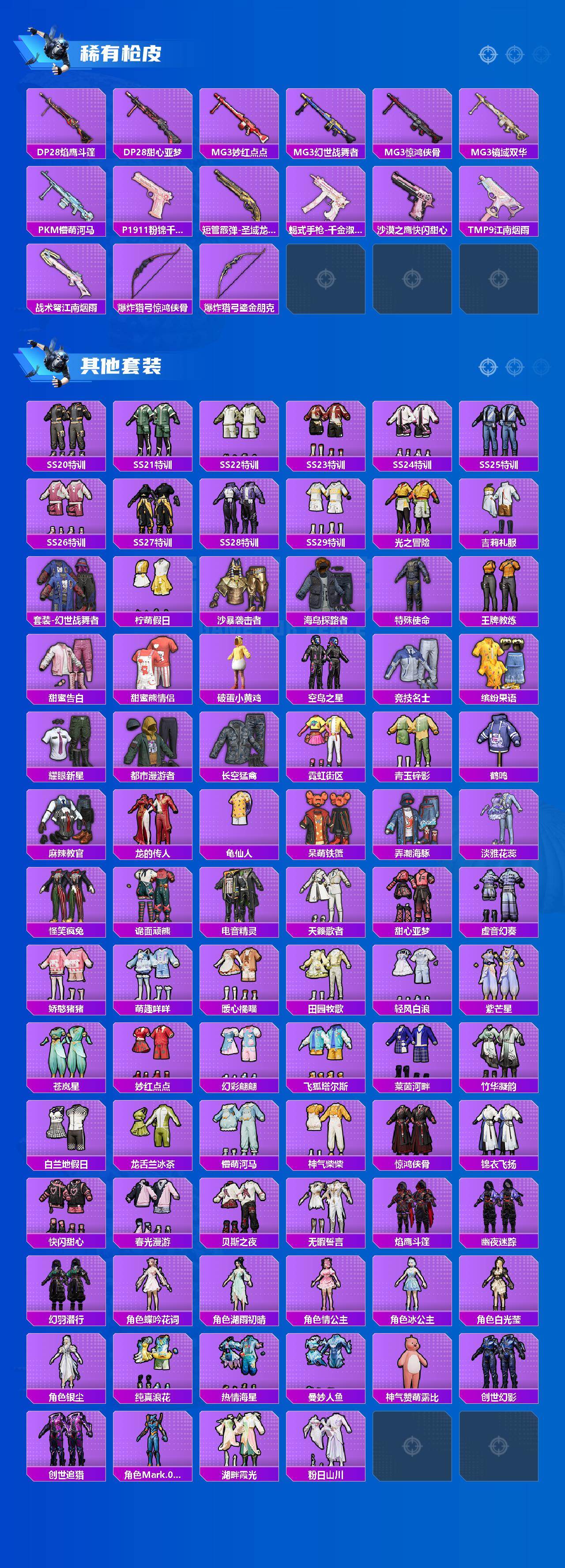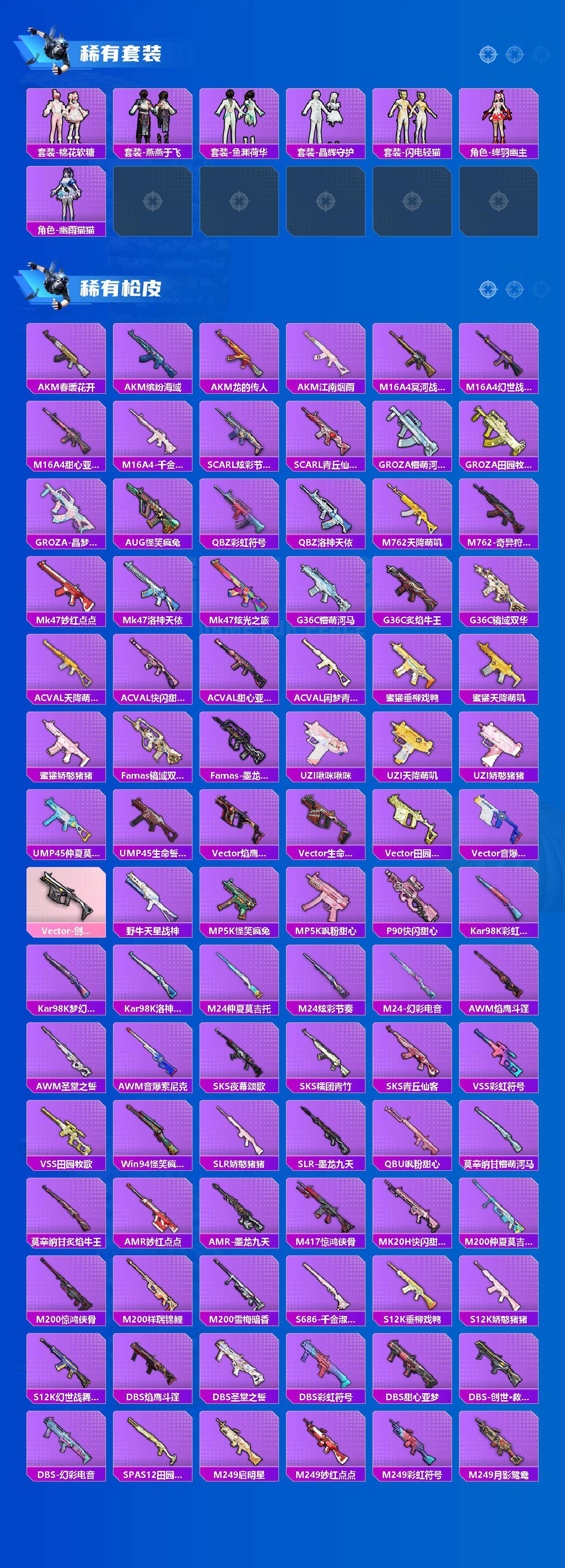 SCAR-L-天蓬元帅,SCAR-L-锦绣绵绵,M416-五爪金龙,M416-墨龙九天,UMP45-启明星,P90-金丰海韵,Kar98K-创世·救赎,Kar98K-巳巳如意,Mk14-精灵梦叶罗丽,M200-梦海之灵,DP-28-圣堂之誓,DP-28-千金淑猫,MG3-洛神天依,MG3-炙焰牛王,PKM-江南烟雨,平底锅-仲夏莫吉托,烟雾弹-猫咪绅士