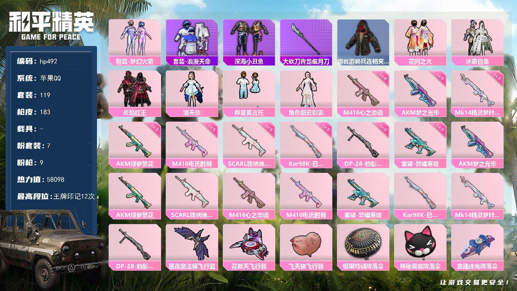 [17243410]苹果 手Q-7粉装-9特效枪-0载具-3粉色飞行器-58098热力值-12王牌印记-119套装-183枪皮