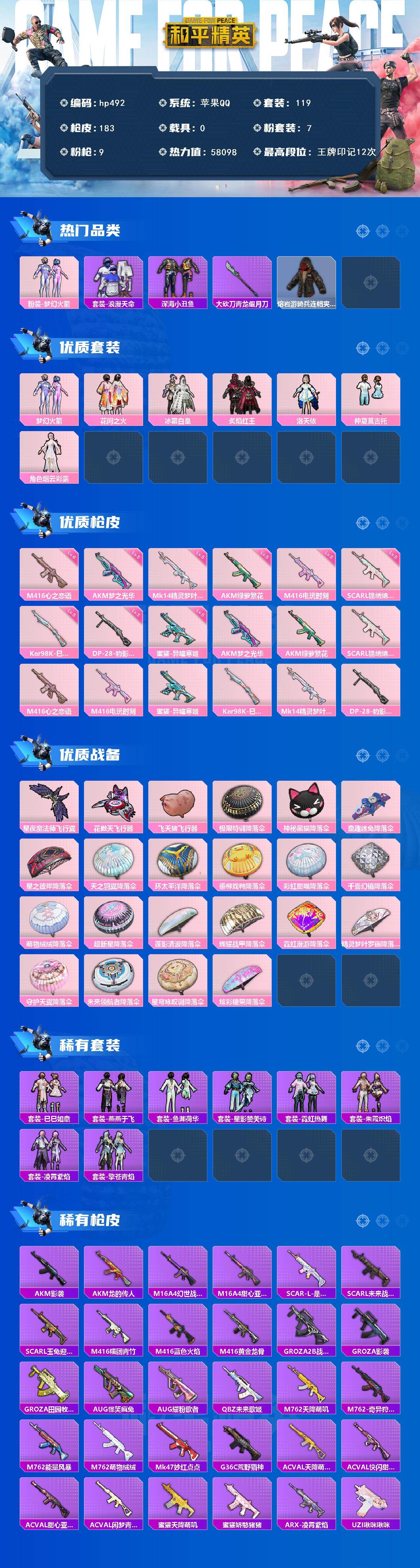 [17243410]苹果 手Q-7粉装-9特效枪-0载具-3粉色飞行器-58098热力值-12王牌印记-119套装-183枪皮 【热门品类】:粉装-梦幻火箭,套装-浪漫天命,套装-深海小丑鱼,大砍刀-青龙偃月刀,熔岩游骑兵连帽夹克 【粉色套装】:粉装-梦幻火箭,粉装-花间之火,粉装-冰霜白皇,粉装-炙焰红王,角色-洛天依,粉装-仲夏莫吉托,角色-烟云彩露 【粉色枪皮等级】:AKM-梦之光华(五级),AKM-绿萝繁花(五级),SCAR-L-锦绣绵绵(五级),M416-心之恋语(六级),M416-电玩时刻(五级),蜜獾-异瞳寒姬(五级),Kar98K-巳巳如意(五级),Mk14-精灵梦叶罗丽(五级),DP-28-豹影疾电(五级) 【粉色枪皮】:AKM-梦之光华,AKM-绿萝繁花,SCAR-L-锦绣绵绵,M416-心之恋语,M416-电玩时刻,蜜獾-异瞳寒姬,Kar98K-巳巳如意,Mk14-精灵梦叶罗丽,DP-28-豹影疾电 【粉色飞行器】:星夜魔法师飞行翼,花傲天飞行器,飞天猪飞行器 【粉色降落伞】:极限特训降落伞,神秘黑猫降落伞,童趣迷兔降落伞,星之彼岸降落伞,天之羽翼降落伞,环太平洋降落伞,垂柳戏鸭降落伞,彩虹甜喵降落伞,千面幻镜降落伞,萌物绒绒降落伞,超新星降落伞,莲影清波降落伞,辉耀战甲降落伞,霓虹漫游降落伞,精灵梦叶罗丽降落伞,守护天翼降落伞,未来领航者降落伞,星穹咏叹调降落伞,炫彩糖果降落伞 【稀有套装】:套装-巳巳如意,套装-燕燕于飞,套装-鱼渊荷华,套装-星影赞美诗,套装-霓虹热舞,套装-朱霞炽焰,套装-凌霄紫焰,套装-擎苍青焰 【稀有枪皮】:AKM-影袭,AKM-龙的传人,M16A4-幻世战舞者,M16A4-甜心亚梦,SCAR-L-是爱神辣,SCAR-L-未来战士,SCAR-L-玉兔迎春,M416-糯团青竹,M416-蓝色火焰,M416-黄金龙骨,GROZA-2B战斗服款,GROZA-影袭,GROZA-田园牧歌,AUG-怪笑疯兔,AUG-耀粉歌者,QBZ-未来歌姬,M762-天降萌叽,M762-奇异狩猎者,M762-能量风暴,M762-萌物绒绒,Mk47-妙红点点,G36C-荒野猎神,AC-VAL-天降萌叽,AC-VAL-快闪甜心,AC-VAL-甜心亚梦,AC-VAL-闲梦青缨,蜜獾-天降萌叽,蜜獾-娇憨猪猪,ARX-凌霄紫焰,UZI-啾咪啾咪,UZI-天降萌叽,UZ