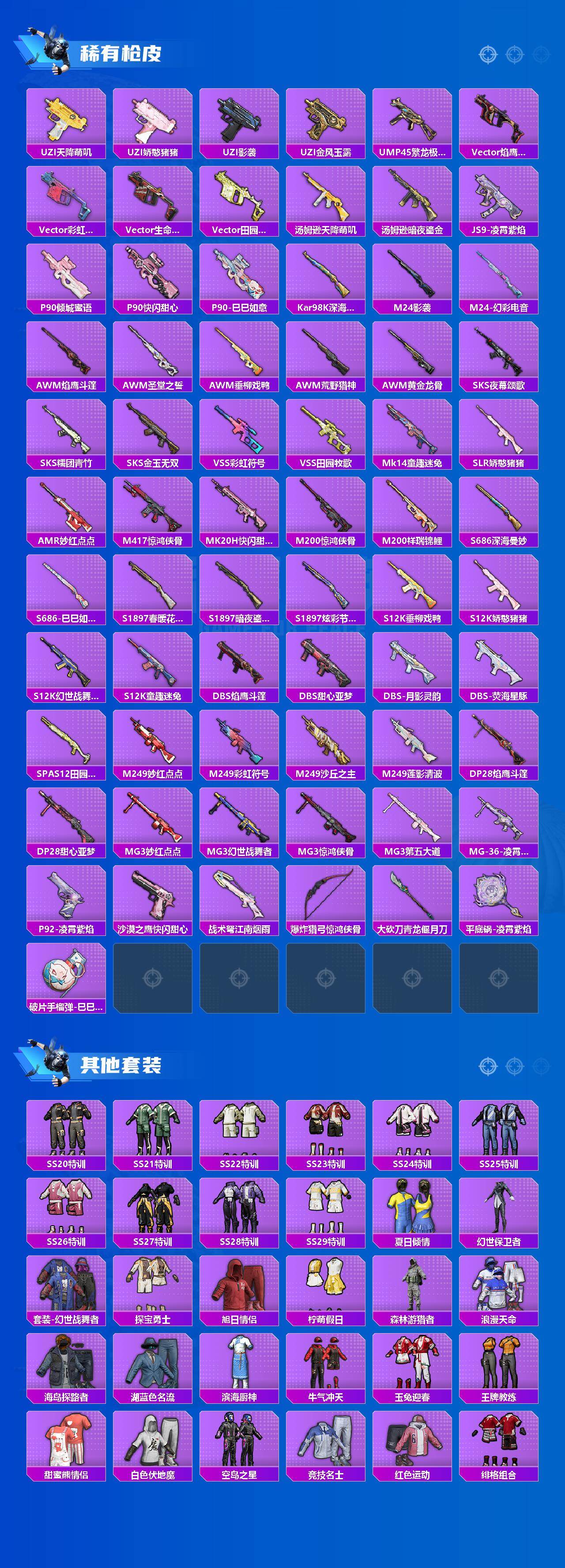 【稀有枪皮】:AKM-影袭,AKM-龙的传人,M16A4-幻世战舞者,M16A4-甜心亚梦,SCAR-L-是爱神辣,SCAR-L-未来战士,SCAR-L-玉兔迎春,M416-糯团青竹,M416-蓝色火焰,M416-黄金龙骨,GROZA-2B战斗服款,GROZA-影袭,GROZA-田园牧歌,AUG-怪笑疯兔,AUG-耀粉歌者,QBZ-未来歌姬,M762-天降萌叽,M762-奇异狩猎者,M762-能量风暴,M762-萌物绒绒,Mk47-妙红点点,G36C-荒野猎神,AC-VAL-天降萌叽,AC-VAL-快闪甜心,AC-VAL-甜心亚梦,AC-VAL-闲梦青缨,蜜獾-天降萌叽,蜜獾-娇憨猪猪,ARX-凌霄紫焰,UZI-啾咪啾咪,UZI-天降萌叽,UZ